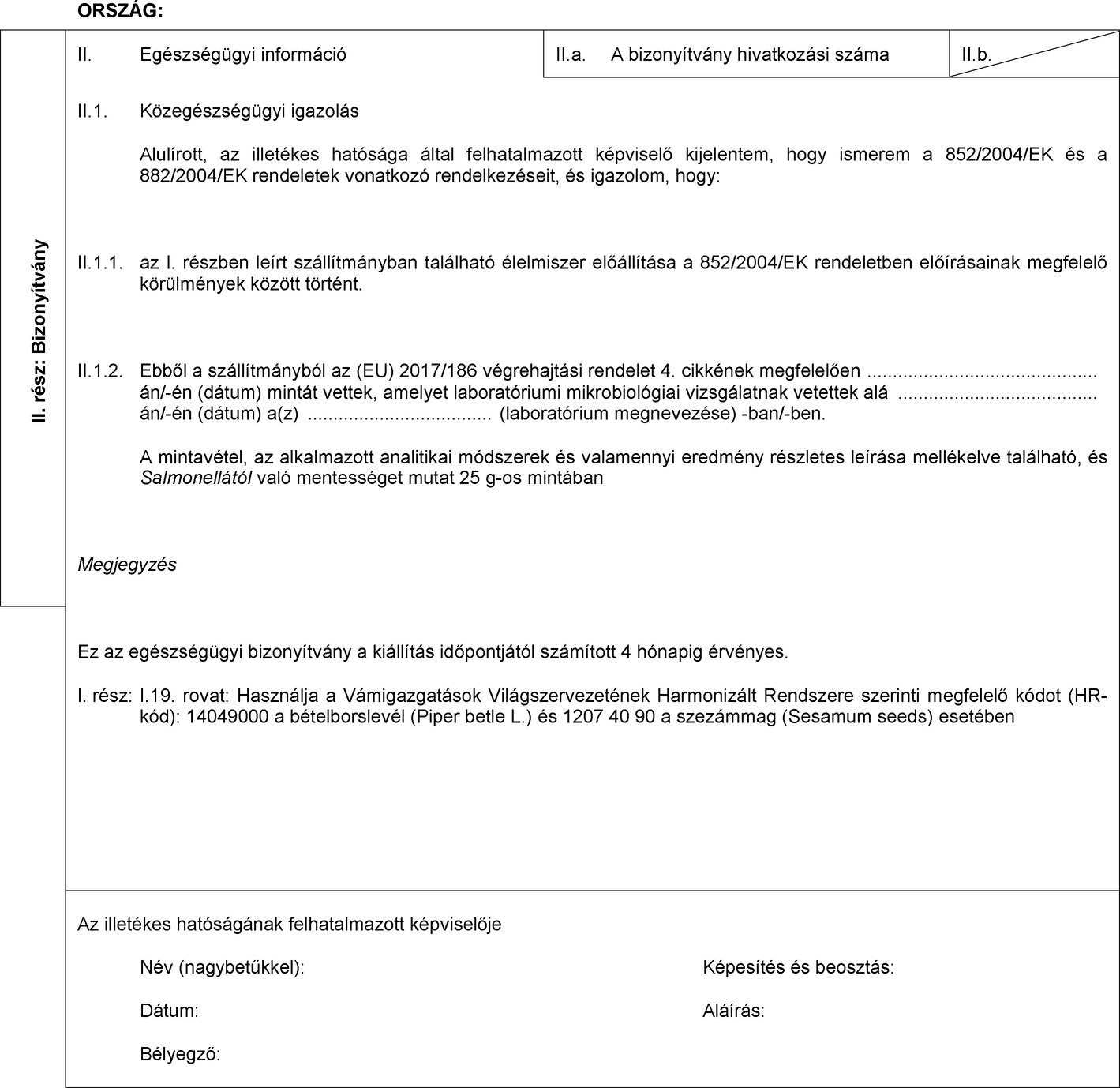 II. 1.2. Ebből a szállítmányból az (EU) 2017/186 végrehajtási rendelet 4. cikkének megfelelően án/-én (dátum) mintát vettek, amelyet laboratóriumi mikrobiológiai vizsgálatnak vetettek alá án/-én (dátum) a(z) (laboratórium megnevezése) -ban/-ben.
