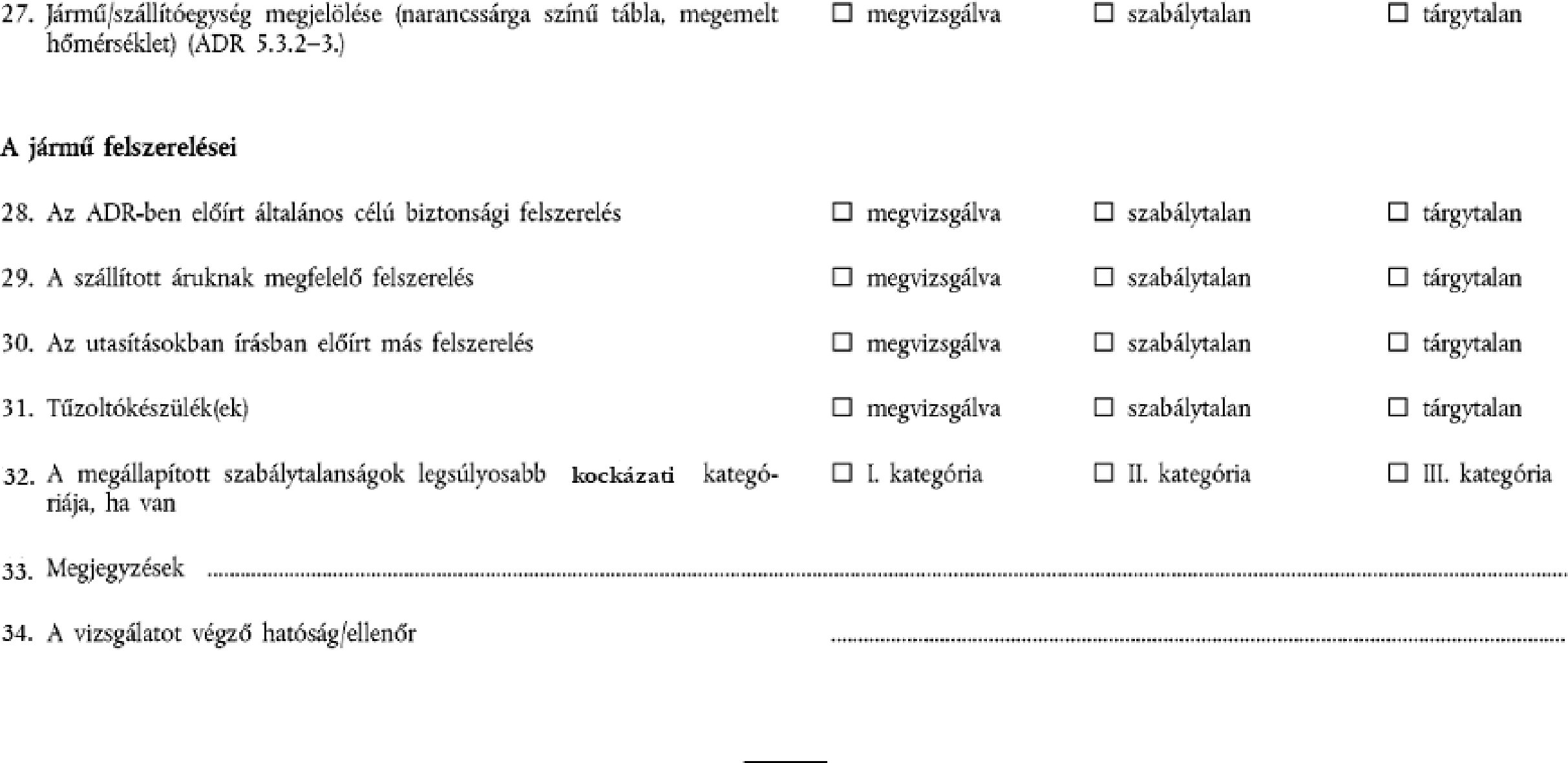 Amennyiben a releváns ADR-rendelkezések betartásának elmulasztása személyi sérülés vagy környezetkárosodás kockázatát idézi elő; az ilyen mulasztások általában megfelelő helyesbítő intézkedések meghozatalát tennék szükségessé, mint például a szabálytalanságnak az ellenőrzés helyén történő megszüntetését, ha ez lehetséges és megfelelő, de legkésőbb a folyamatban lévő szállítási művelet befejezésekor.