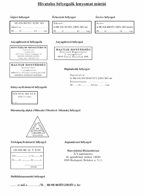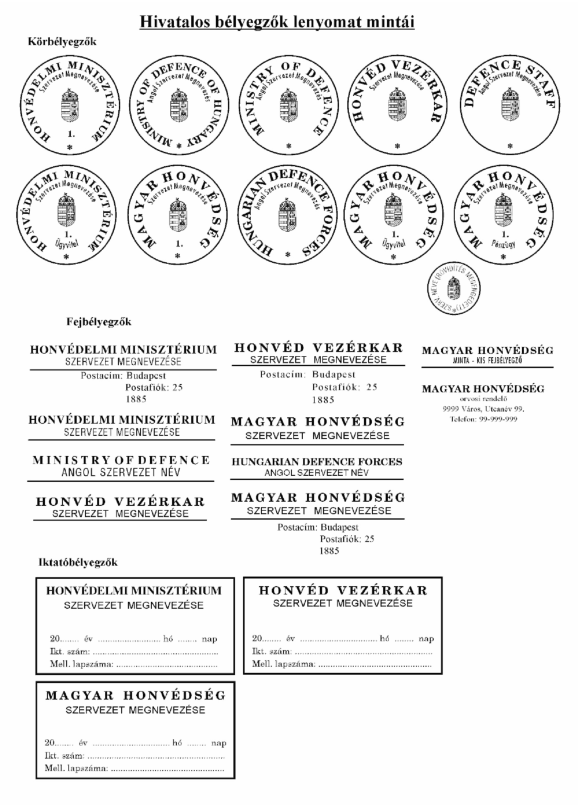 9. § (1)[2] A honvédelmi szervezet kizárólag az MH központi nyilvántartó szerve által központilag kiadott és nyilvántartásba vett bélyegzőt használhatja.