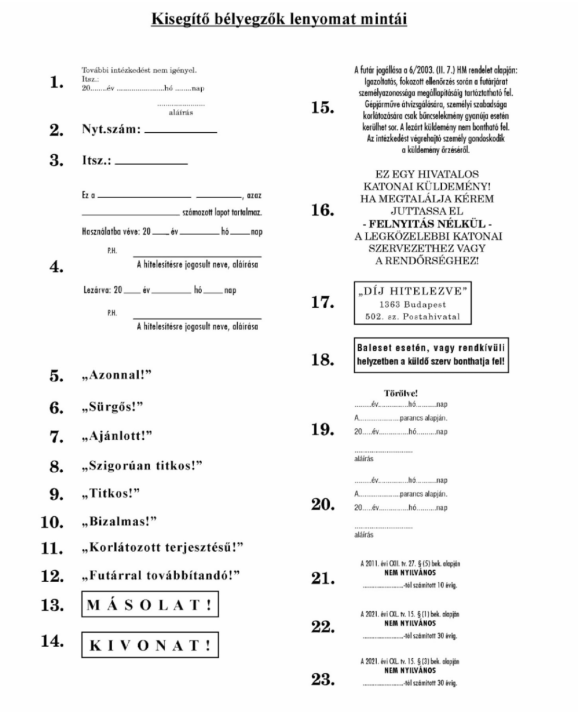 (2) A futár és tábori posta feliratú, sorszámozott bélyegzőkön feltüntetett törzsszámot hadiállapot idején tábori postaszámként kell használni.