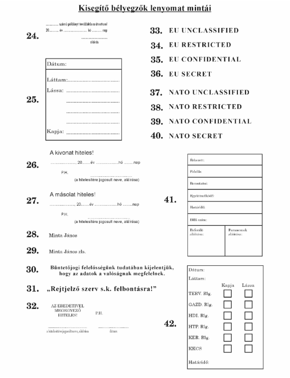 (5) A nem hivatalos, kisegítő bélyegző a minősítési, az iratkezelési és postai, a tábori postakezelési jelzés, a névaláírást helyettesítő, valamint a záradékbélyegző. A kisegítő bélyegző hitelesítésre, kiadmányozásra nem használható.