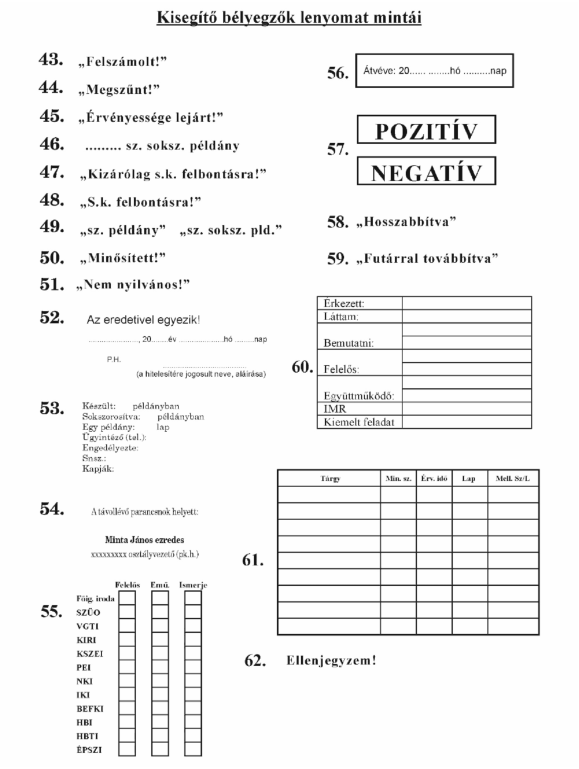 6. § (1) Az alábbi, címer nélküli, különböző formájú bélyegző használatát a szakmai illetékességgel rendelkező szervek szervezetek vezetői határozzák meg: