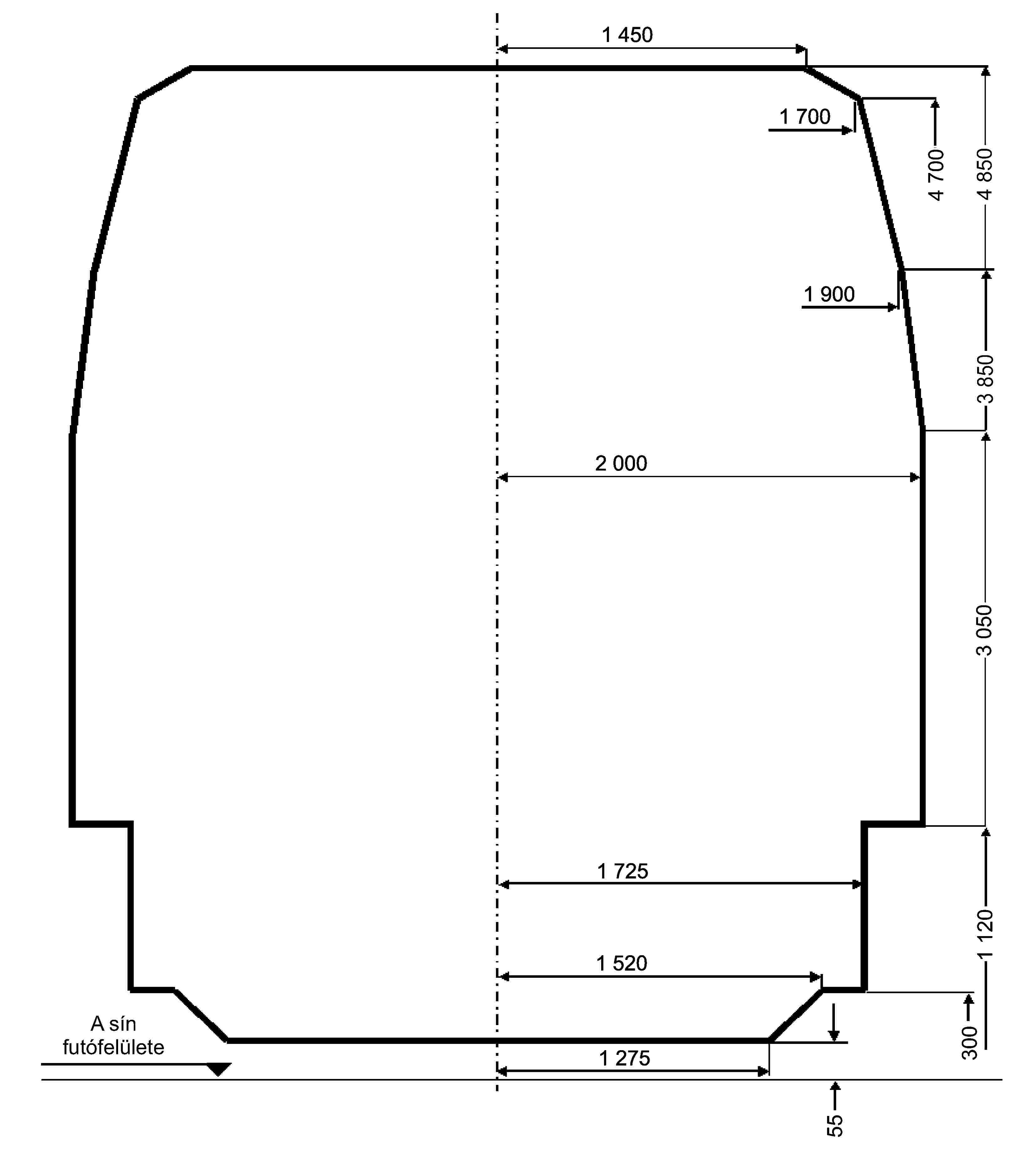 Kinematikus referenciaprofil / Kinematische Referenzfahrzeugbegrenzung / Profil cinematique de référence | A meghatározást lásd a nagy sebességű vasúti járművekre vonatkozó ÁME-ben. |