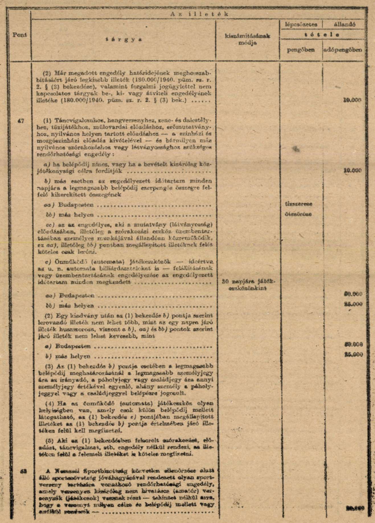 (2) A táblázatok a tárgy értékétől függő - lépcsőzetes - illetéktételeket pengőértékben, az értéktől független - állandó - tételeket, valamint a lépcsőzetes tételeknek állandó összegben megállapított alsó vagy felső határát pedig adópengőben tüntetik fel. A lépcsőzetes illetéktételt is adópengőben megállapítottnak kell azonban tekinteni, ha alapjául adópengőben meghatározott érték szolgál (például az V. táblázat 8., 9. pontja, VI. táblázat 49. és 50. pontja).