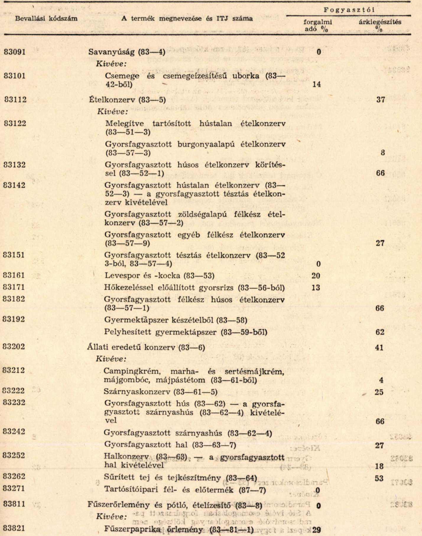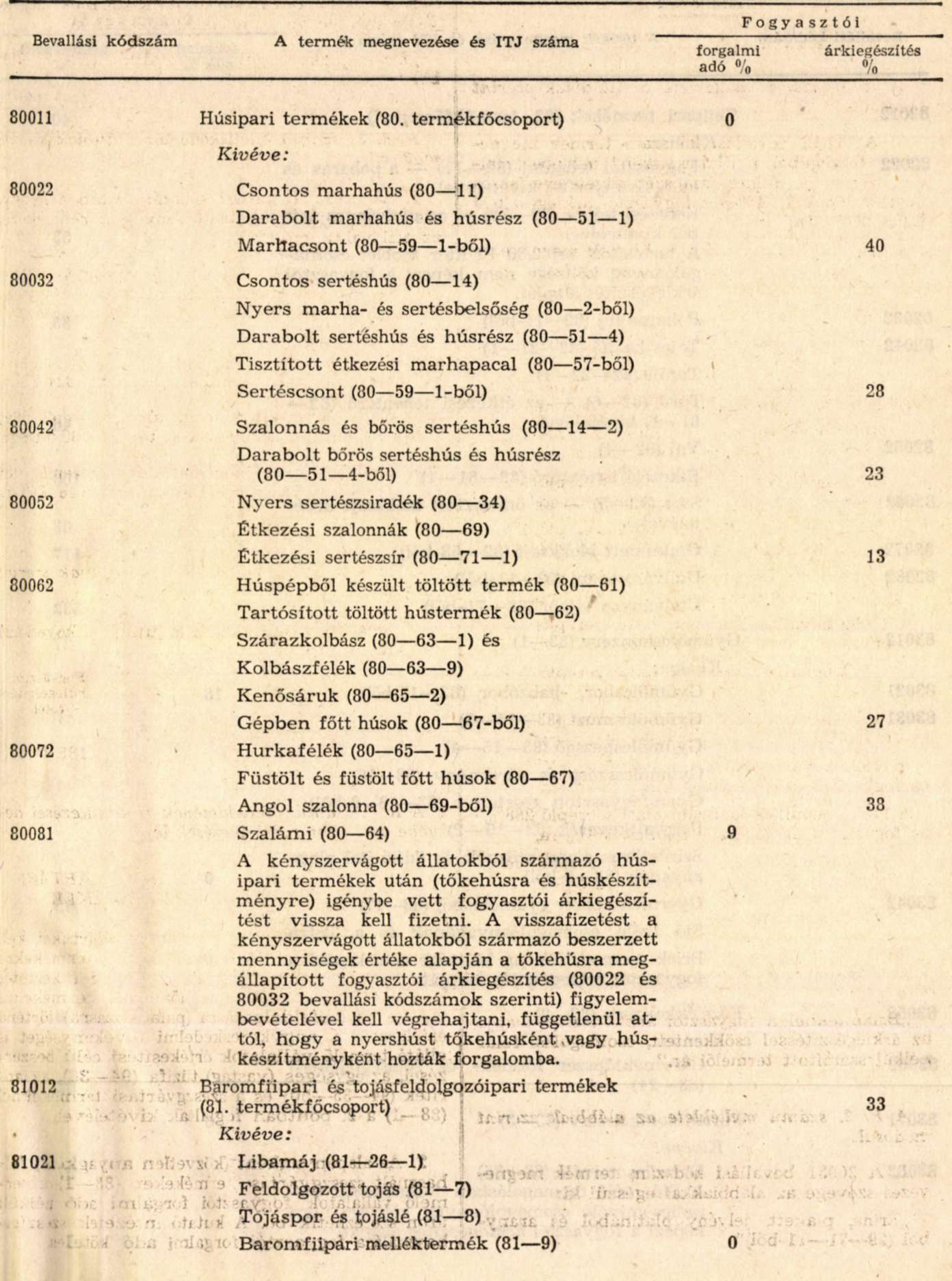 "(4) A kiskereskedelmi vállalatok a fogyasztói forgalmi adót és a fogyasztói árkiegészítést a bérmunkában készíttetett vagy adózatlanul, árkiegészítés nélkül beszerzett (a piaci forgalomban, házi iparostól stb. felvásárolt), valamint a termelőüzemükben előállított termékek után a kiskereskedelmi irányárréssel csökkentett, beszerzéskor, illetve kiszállításkor érvényes fogyasztói ár alapulvételével kötelesek fizetni, illetve igényelni."