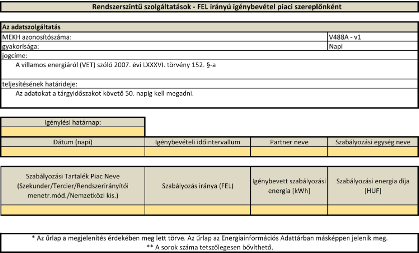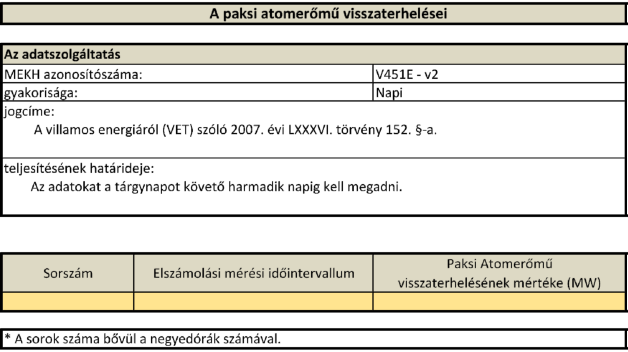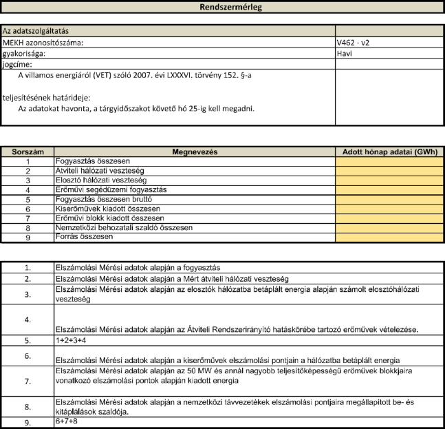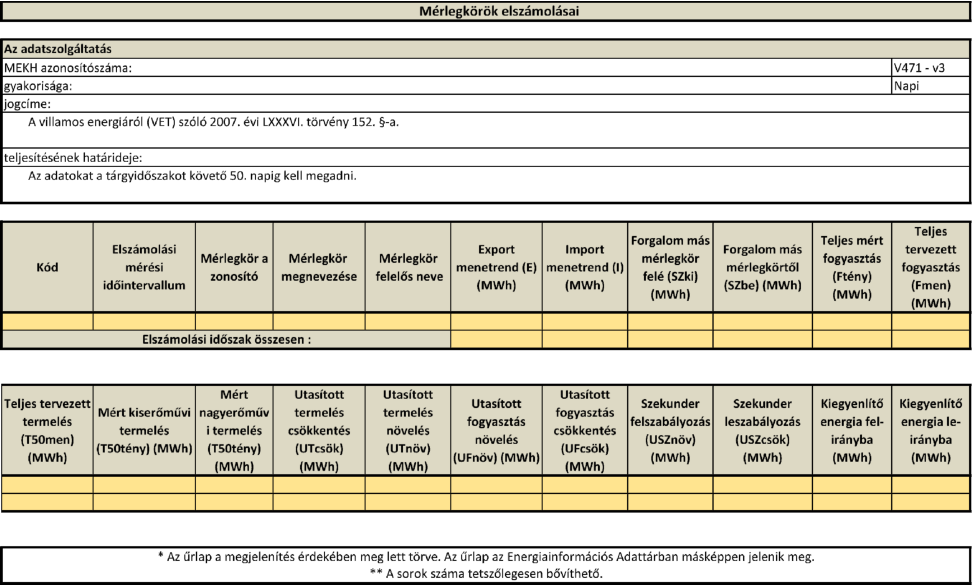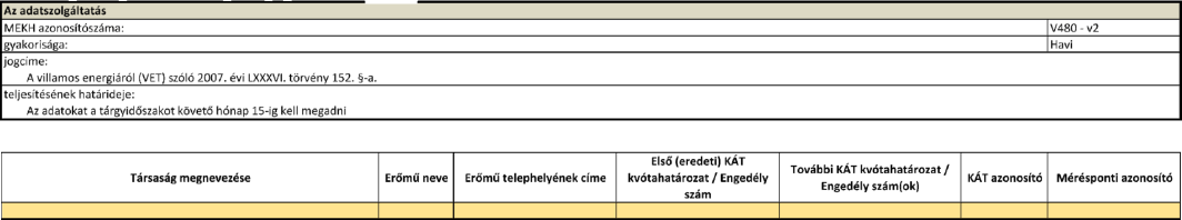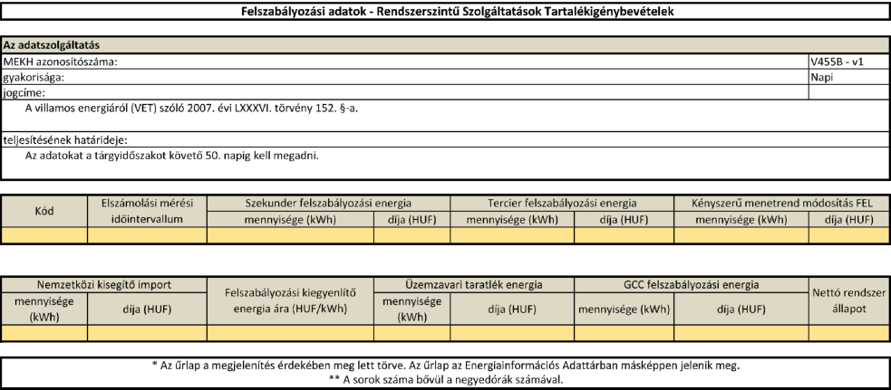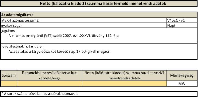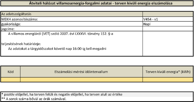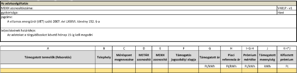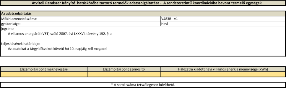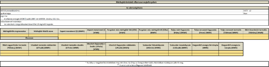 * A megújuló energiaforrásból vagy hulladékból nyert energiával termelt villamos energia, valamint s kapcsoltan termelt villamos energia kötelező átvételéről és átvételi áráról szóló 389/2007. (XII. 23.) Kormány rendelet alapján a kötelező átvétel alá eső villamos energia átvevőjének havi adatszolgáltatási kötelezettsége. Az adatlap tartalmilag azonos a fenti rendelet 8. számú mellékletében szereplő kimutatással. A fogalmak meghatározásai a rendeletben megtalálhatóak.