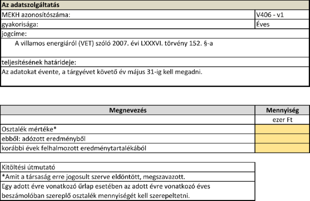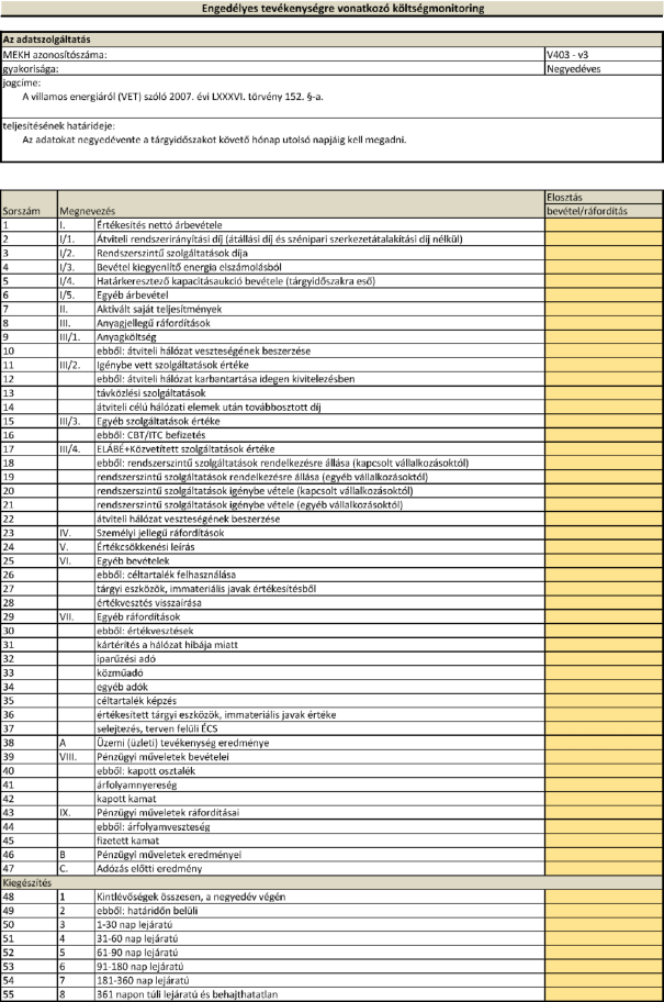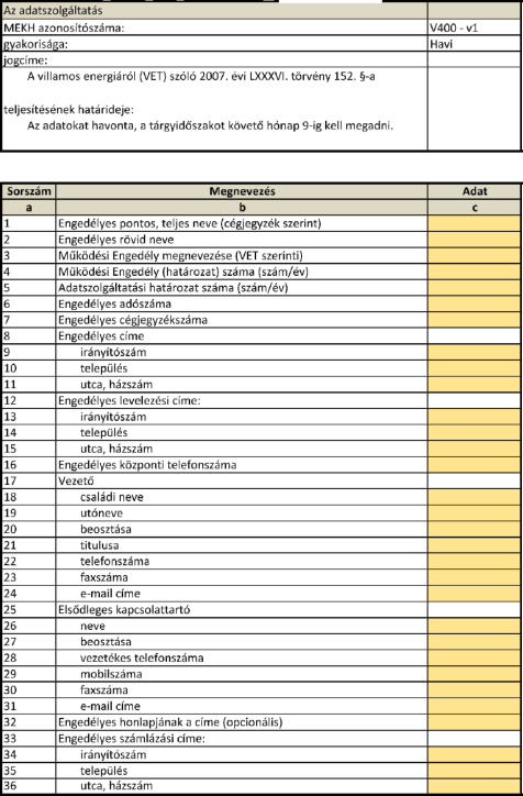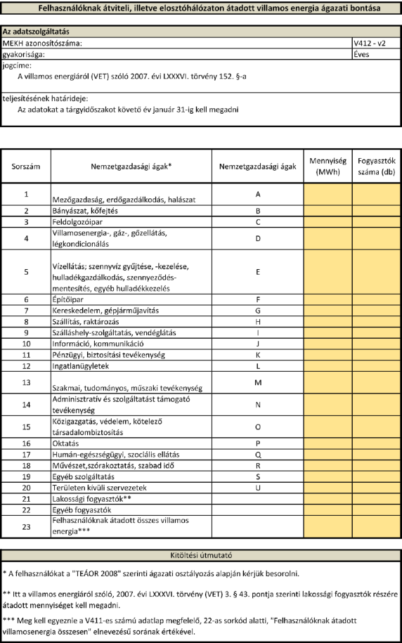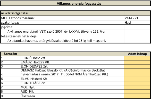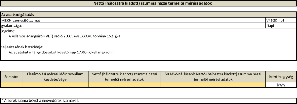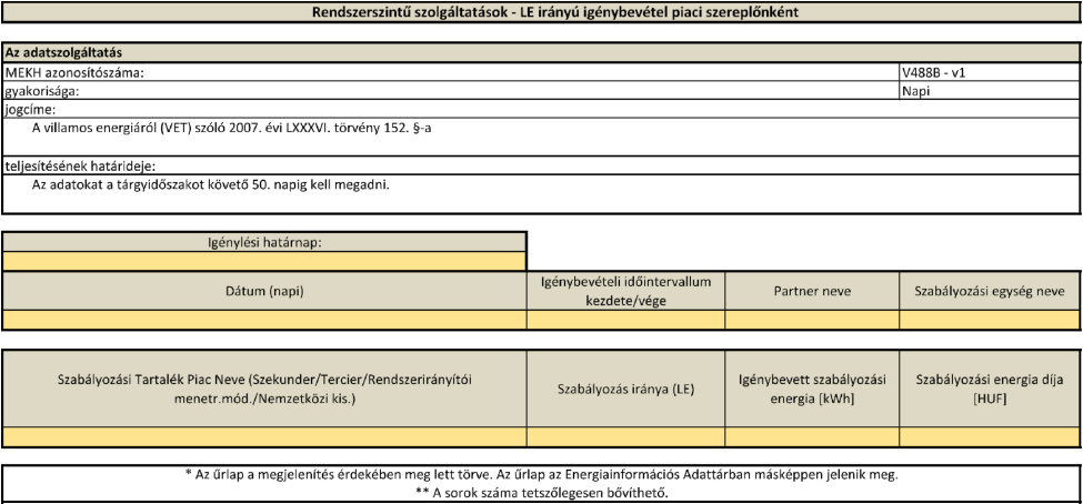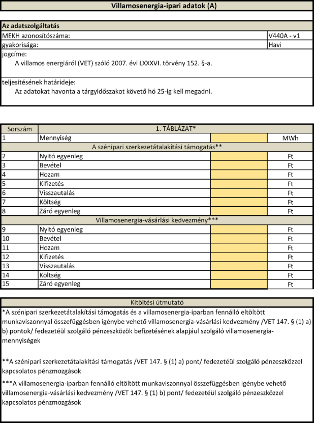 * A megújuló energiaforrásból vagy hulladékból nyert energiával termelt villamos energia, valamint s kapcsoltan termelt villamos energia kötelező átvételéről és átvételi áráról szóló 389/2007. (XII. 23.) Kormány rendelet alapján a kötelező átvétel alá eső villamos energia átvevőjének havi adatszolgáltatási kötelezettsége. Az adatlap tartalmilag azonos a fenti rendelet 8. számú mellékletében szereplő kimutatással. A fogalmak meghatározásai a rendeletben megtalálhatóak.