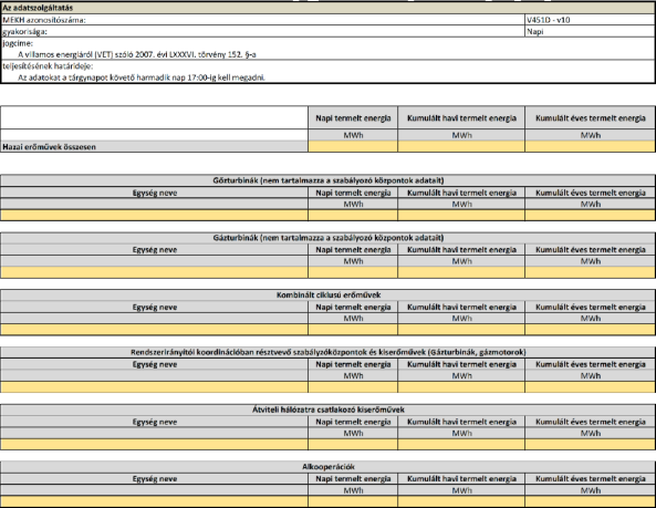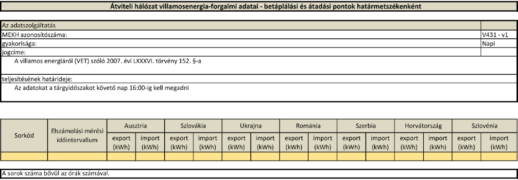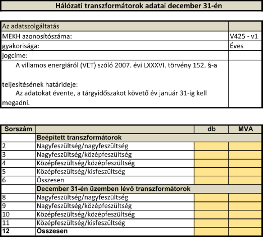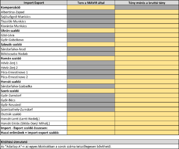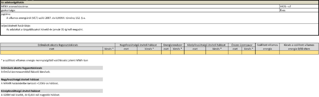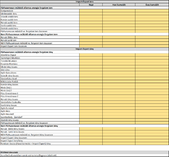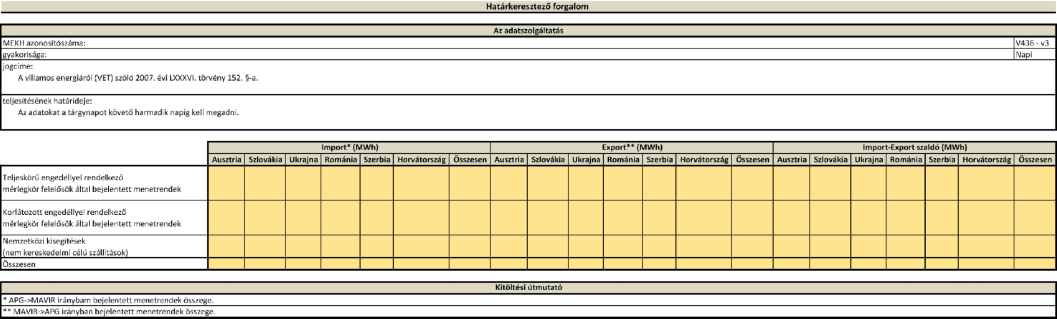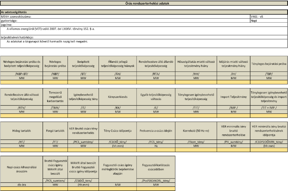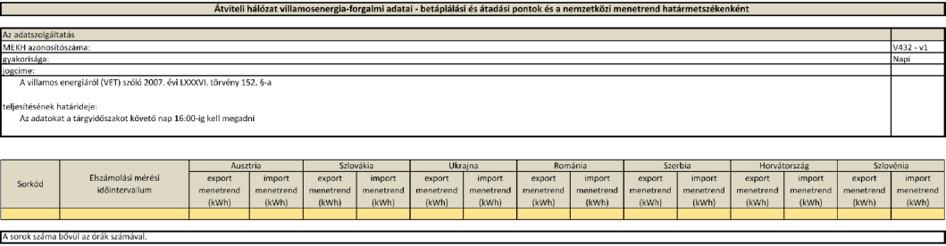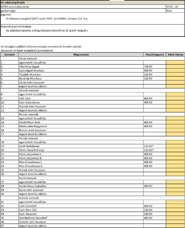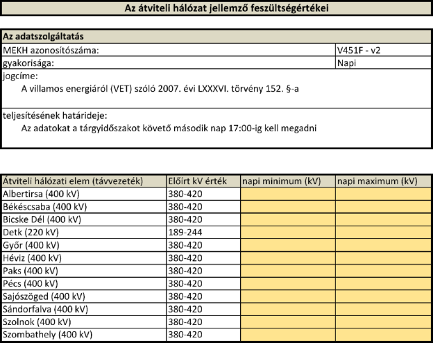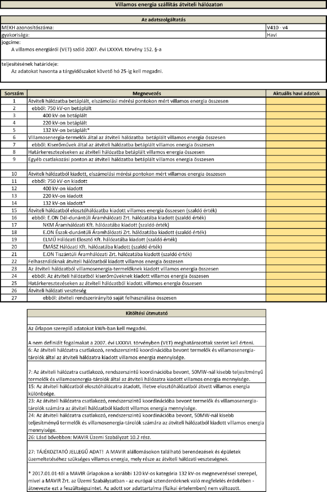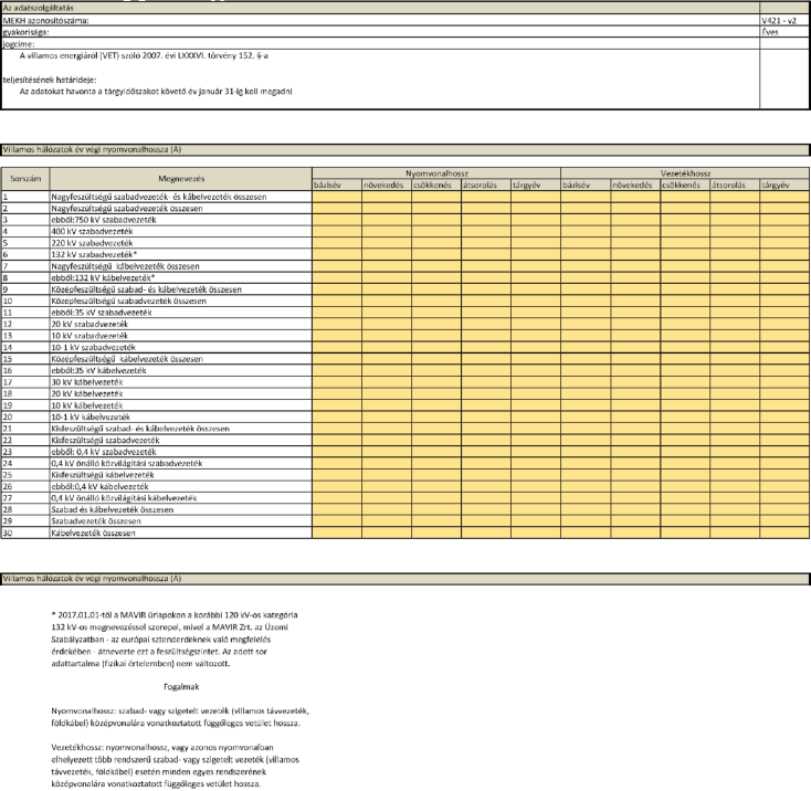 * 2017.01.01-től a MAVIR űrlapokon a korábbi 120 kV-os kategória 132 kV-os megnevezéssel szerepel, mivel a MAVIR Zrt. az Üzemi Szabályzatban - az európai sztenderdeknek való megfelelés érdekében - átnevezte ezt a feszültségszintet. Az adott sor adattartalma (fizikai értelemben) nem változott.