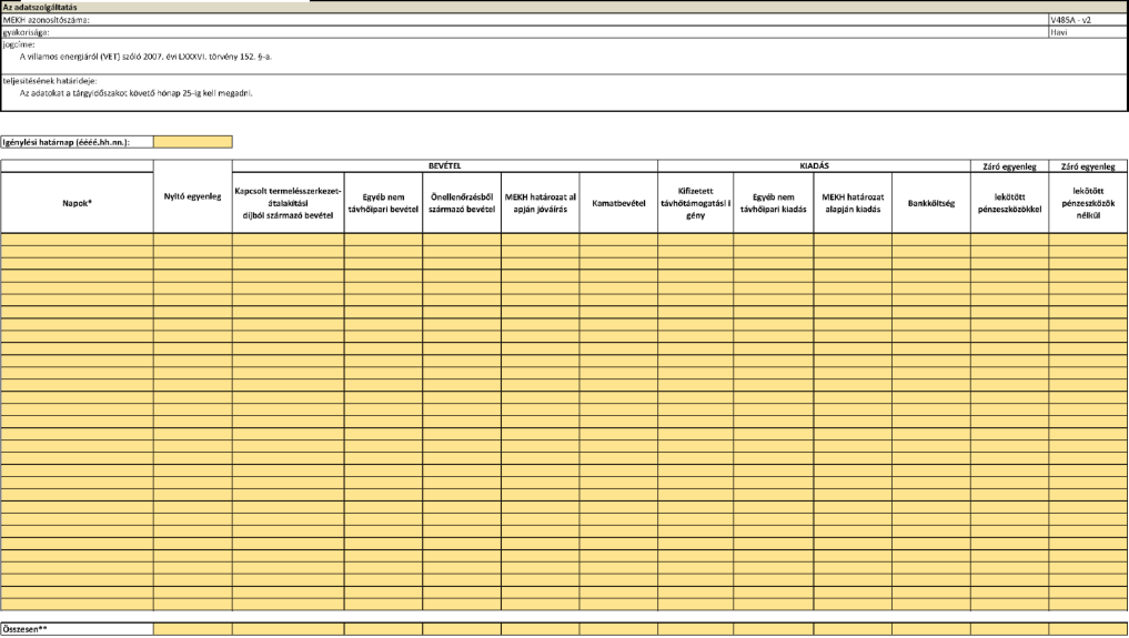 ** Az "Összesen**" sorban a "Záró egyenleg" oszlopokhoz tartozó cellákban kérjük, az adott hónap utolsó napjához tartozó záró egyenleg összegeket szíveskedjenek feltüntetni. Az adatok Ft-ban értendőek.