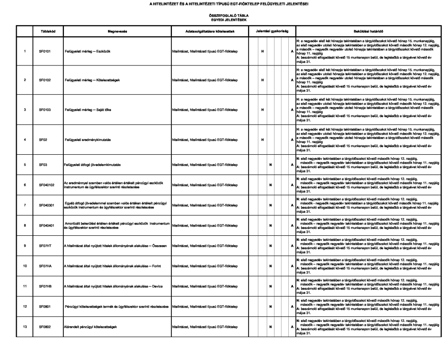 5. § (1) A pénzügyi vállalkozás és az ezen típusú EGT-fióktelep a 4. mellékletben foglaltaknak megfelelő tartalommal, formában, gyakorisággal és határidőre felügyeleti jelentést teljesít az MNB részére.