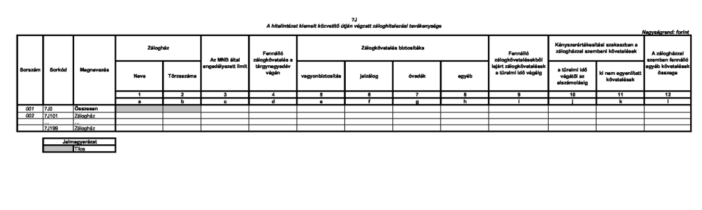 11. § (1) A szakosított hitelintézetként működő központi értéktár és a hitelintézettel egyenértékű prudenciális szabályozásnak megfelelő pénzügyi vállalkozás kivételével a hitelintézet, a kijelölt, összevont alapú felügyelet alá tartozó pénzügyi vállalkozás, valamint az ezen típusú EGT-fióktelepek az ingatlantranzakciókra vonatkozó negyedéves felügyeleti jelentést (jelentéskód: ING) a 16. mellékletben foglaltaknak megfelelő tartalommal, formában, a tárgyidőszakot követő hónap 20. munkanapjáig teljesítik az MNB részére.