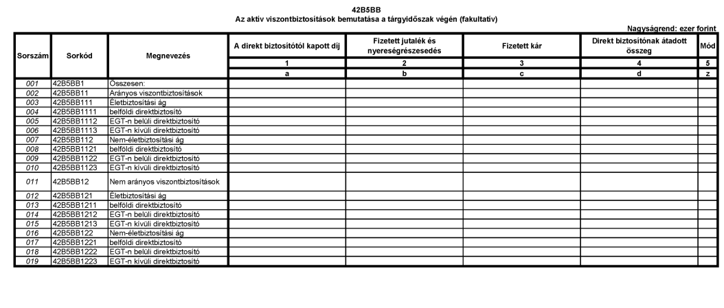a) a 42A19 táblakódú felügyeleti jelentést a biztosítási piaci szervezetek által a jegybanki információs rendszerhez elsődlegesen a Magyar Nemzeti Bank felügyeleti feladatai ellátása érdekében teljesítendő adatszolgáltatási kötelezettségekről szóló 53/2022. (XII. 2.) MNB rendelet módosításáról szóló 59/2023. (XI. 24.) MNB rendelet (a továbbiakban: Módosító rendelet) 2. melléklet 1. pontjával módosított táblaszerkezetben és a Módosító rendelet 3. melléklet 1. pontjával módosított kitöltési előírások szerint,