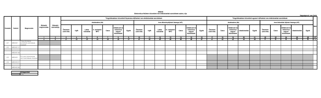Itt kell bemutatni a tárgyidőszakban (félévben) közvetített és a felügyeleti jelentés teljesítése napjáig kötvényesített viszontbiztosítási szerződések darabszámát és éves díját összesen,