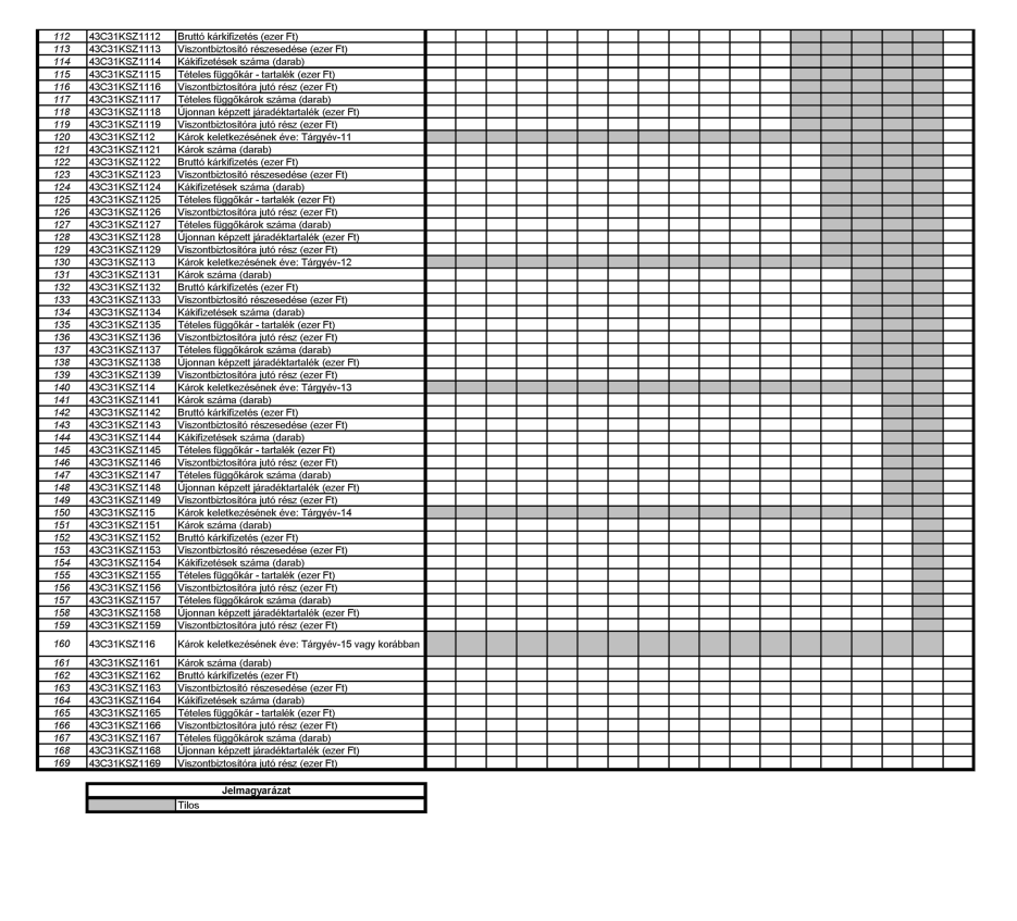 A táblában az adatszolgáltató a Kártalanítási Alappal, valamint a Kártalanítási Számlával kapcsolatos IBNR tartalékot jelenti, a kár keletkezésének éve szerinti megbontásban. Az összesen sor adata megegyezik a Tartaléktábla költségekkel csökkentett IBNR tartalék adatával.