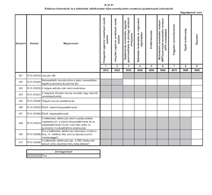 A táblákban az egymillió euro vagy azt meghaladó tárgyévi javadalmazásban részesített vezető állású személyekkel és munkavállalókkal kapcsolatos adatokat kell jelenteni. Minden olyan alkalmazottat jelenteni kell, aki a pénzügyi évben 1 millió euro vagy azt meghaladó javadalmazásban részesült, még akkor is, ha a pénzügyi év vége előtt távozott a befektetési vállalkozástól, vagy ha az 1 millió euro összeget csak a garantált teljesítményjavadalmazás vagy végkielégítés odaítélése miatt érte el.