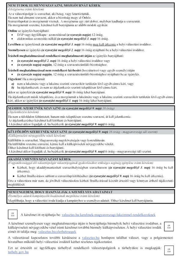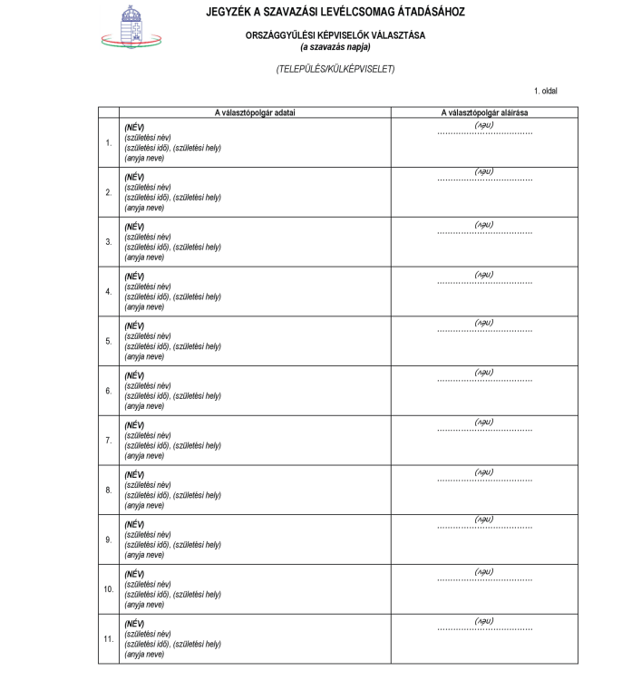 15. a szavazóköri jegyzőkönyvek, a szavazóköri névjegyzék, a mozgóurnát igénylő választópolgárok jegyzéke, valamint a külképviseleti névjegyzék szavazóhelyiségbe kerülő példányának, továbbá a szavazási levélcsomag átadásához készült jegyzék nyomtatásához, valamint a nyomtatás megtörténtéről szóló értesítés továbbításához,