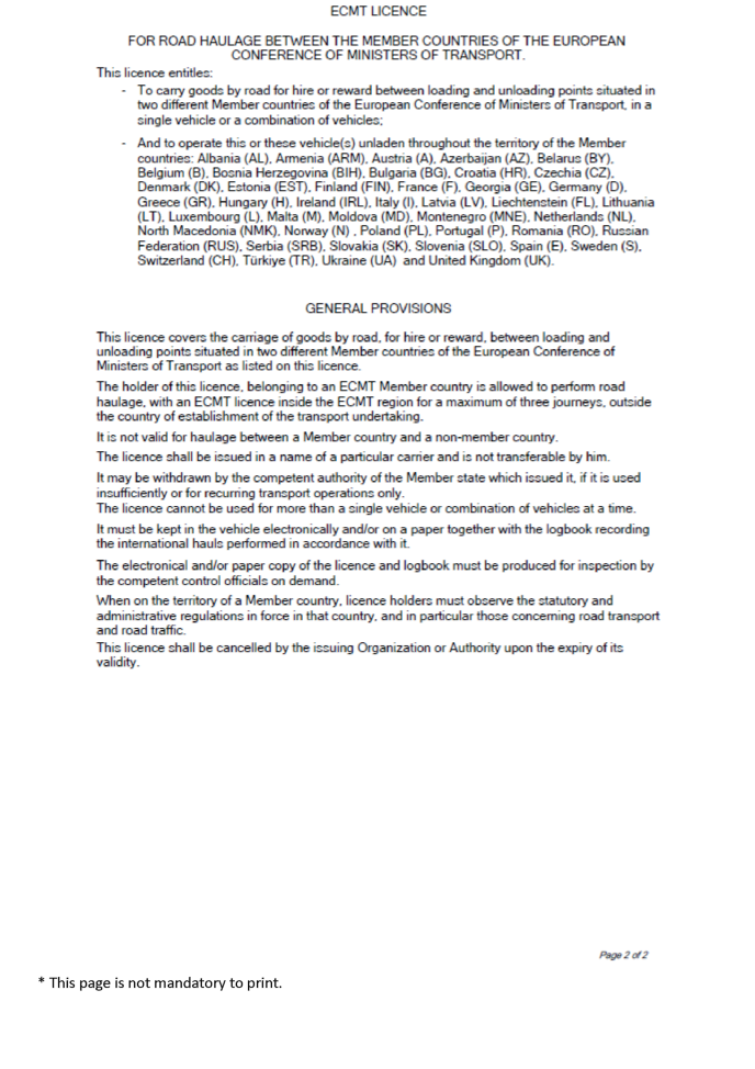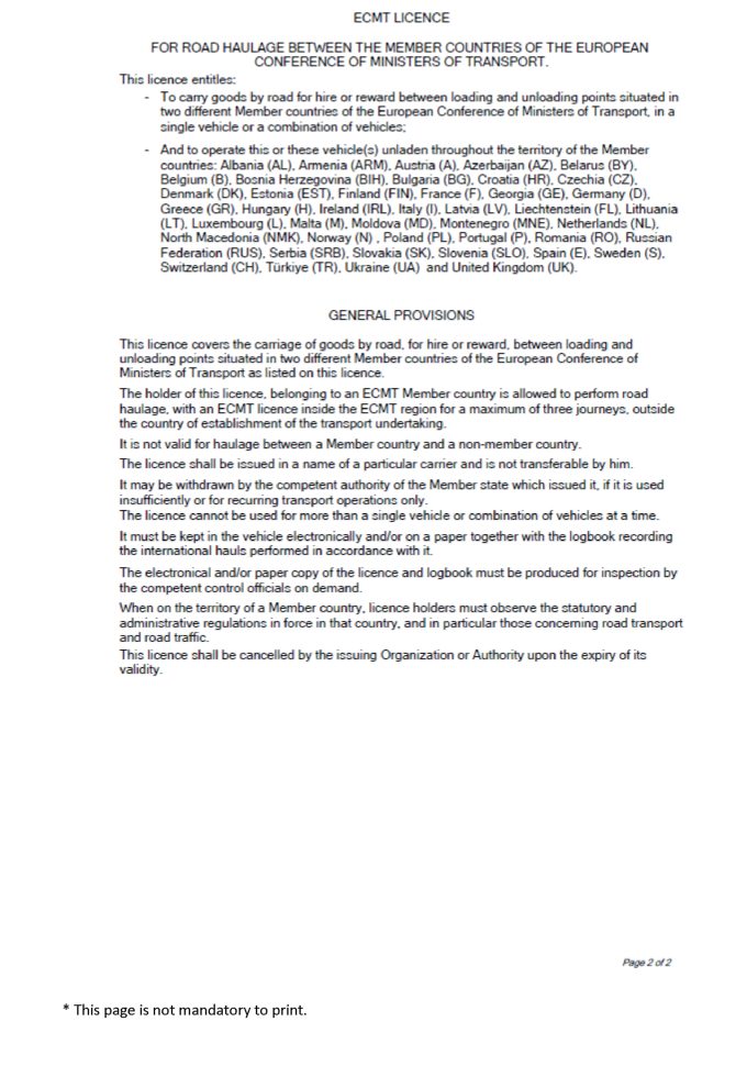 [9] * Az alábbi tagországok tagjai a kvótarendszernek: Albánia, Azerbajdzsán, Belgium, Bosznia-Hercegovina, Bulgária, Csehország, Dánia, az Egyesült Királyság, Észak-Macedónia, Észtország, Fehéroroszország, Finnország, Franciaország, Georgia, Hollandia, Horvátország, Írország, Németország, Lengyelország, Lettország, Liechtenstein, Litvánia, Luxemburg, Magyarország, Málta, Moldova, Montenegró, Norvégia, Oroszország, Örményország, Portugália, Románia, Spanyolország, Svájc, Svédország, Szerbia, Szlovákia, Szlovénia, Törökország és Ukrajna megállapodnak abban, hogy az első út a bejegyzési országából rakottan és üresen is történhet. Az alábbi tagországok: Ausztria, Görögország és Olaszország előírják, hogy a bejegyzési országból az első út rakottan történjen [ITF/TMB/TR/M(2009)3].