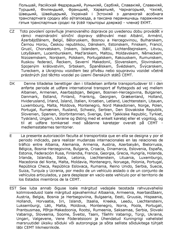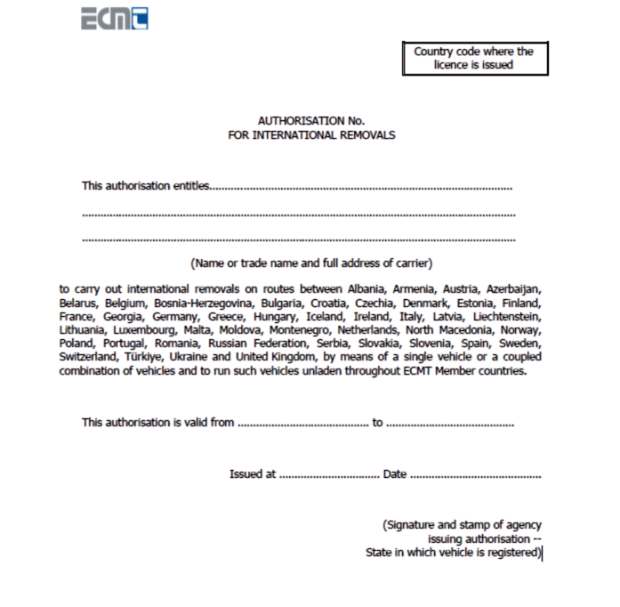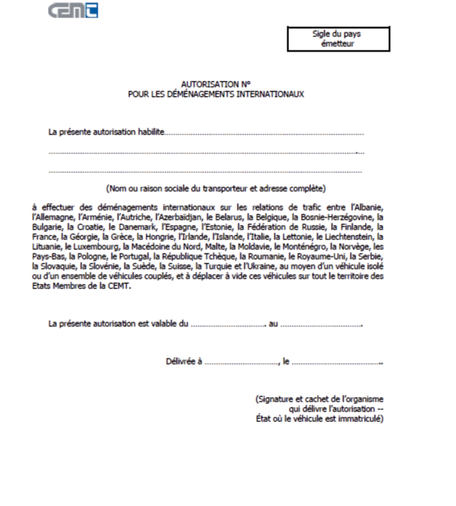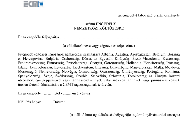 A Nemzetközi költöztetésre vonatkozó CEMT engedélyt CEMT tagországban bejegyzett fuvarozó vállalkozások vehetik igénybe, CEMT tagországok közötti szállítás céljából. Kabotázsra nem jogosít fel.