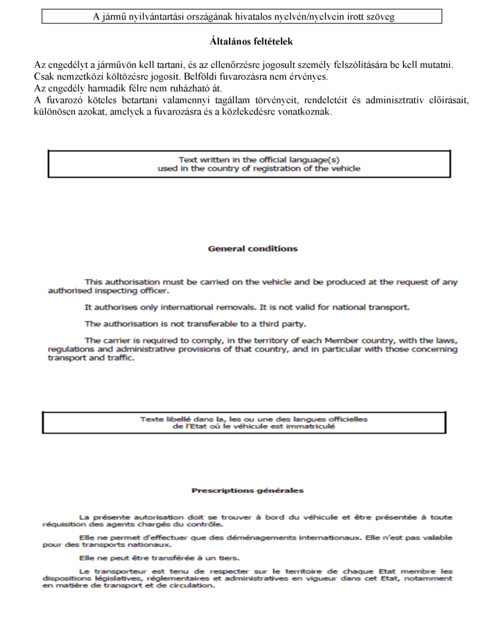 - Engedély: egy adott időszakon belül a tagországok közötti korlátlan számú, a 3.13. pontban meghatározott fuvarozás teljesítésére jogosító multilaterális engedély, amely a megfelelően kitöltött fuvarnaplóval együtt érvényes.