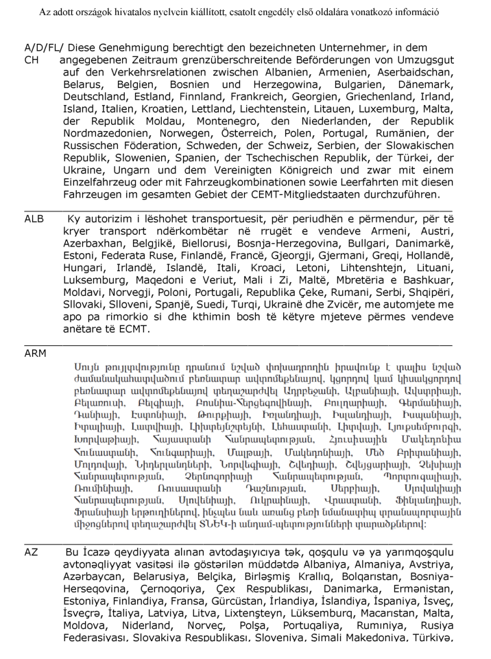 - Járatinformációs dokumentum: a fuvarnapló kivonata, amely információkat tartalmaz egy adott CEMT engedély alatt végrehajtott legutóbbi tíz járatról, ellenőrzési célokra.