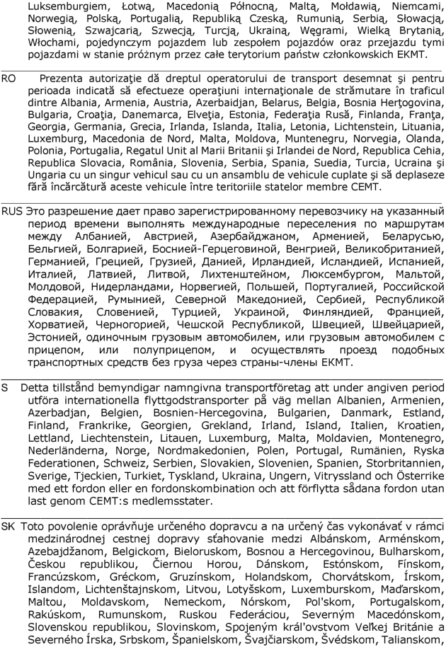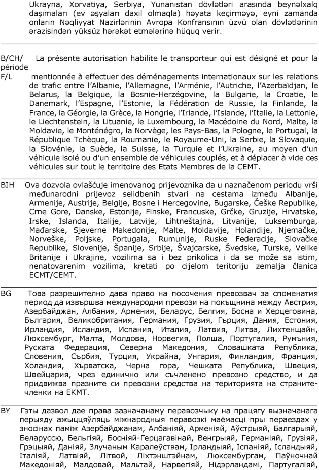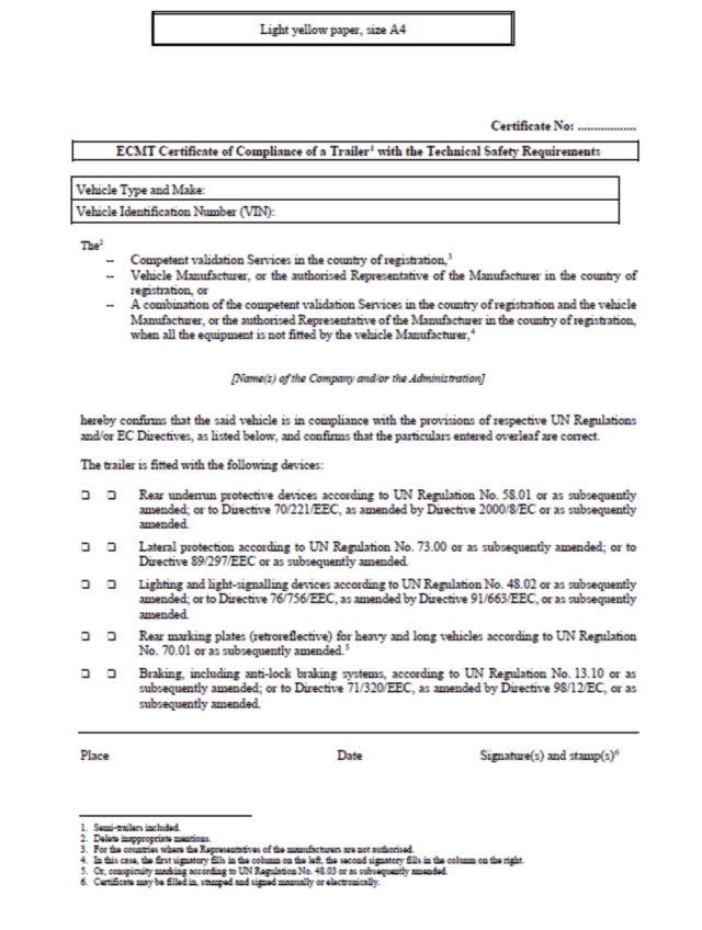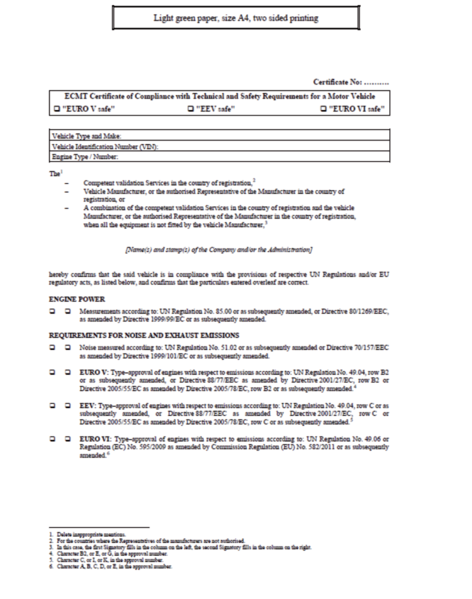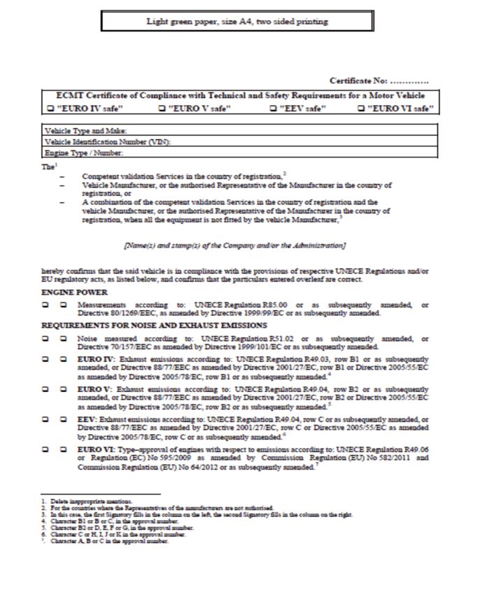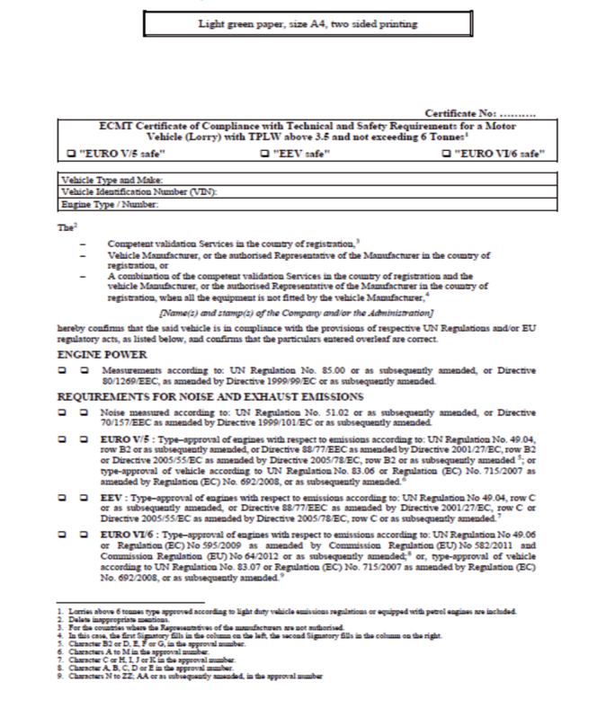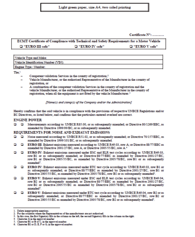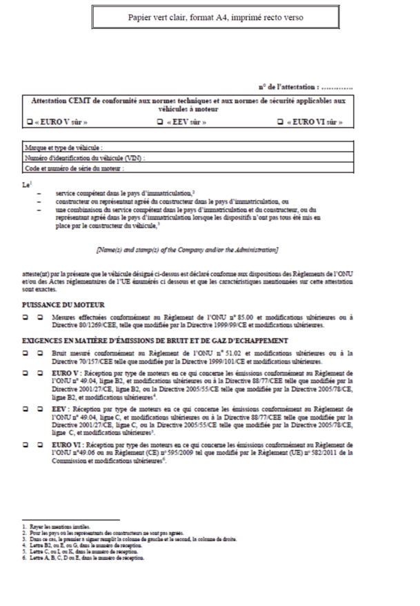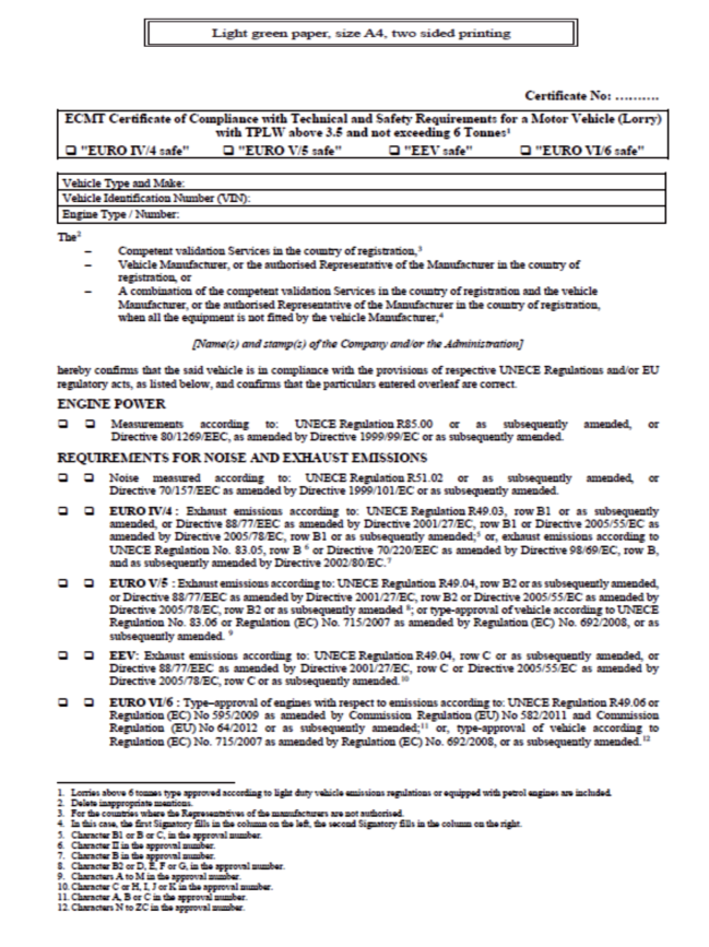 [39] * Figyelem: Az "EEV biztonságos" tehergépkocsikat a CEMT multilaterális kvótán belül nem tekintik külön kategóriának. A CEMT multilaterális engedéllyel működő "EEV biztonságos" tehergépkocsikat az "EURO V biztonságos" kategóriájú CEMT engedélynek kell kísérnie.