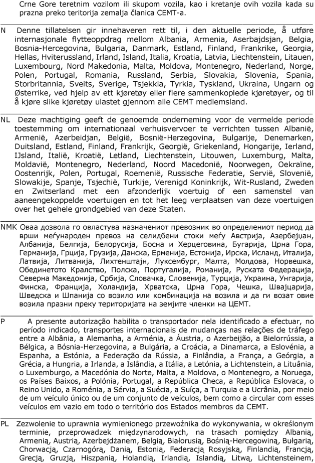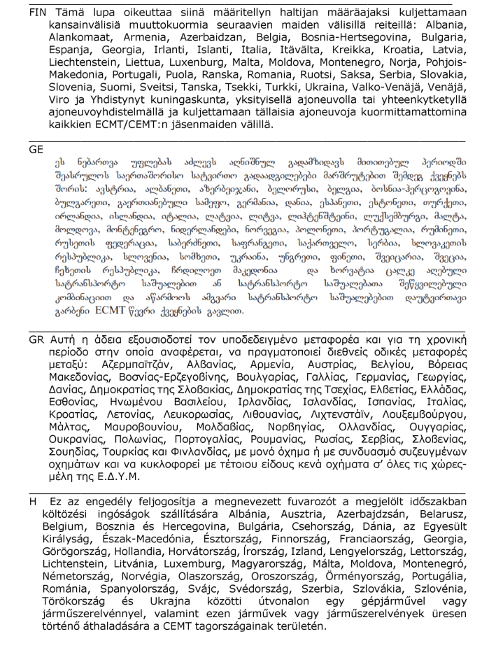 [Például az a jármű, amely Norvégia (a kvótarendszerben részt vevő CEMT tagország) és Irán (nem CEMT tagország, de határos a CEMT egyik tagországával) között bonyolít le fuvarozást, nem használhatja a CEMT engedélyt az ilyen fuvarozásokhoz.]