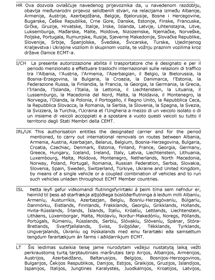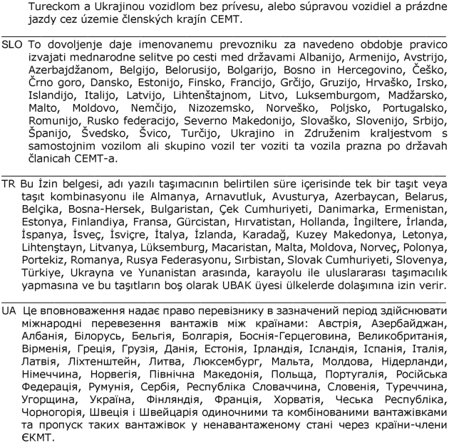 - Multilaterális jelleg: az engedély használatának lehetősége a bejegyzési országon kívüli tagországok között történő fuvarozási műveletekhez.