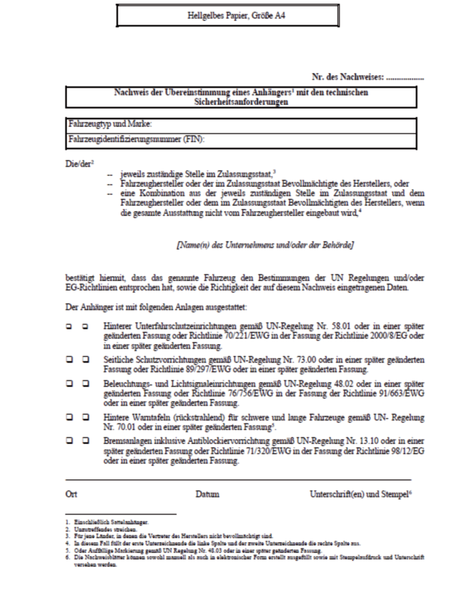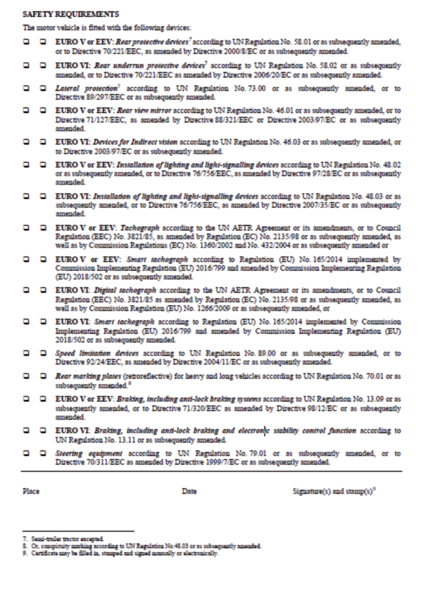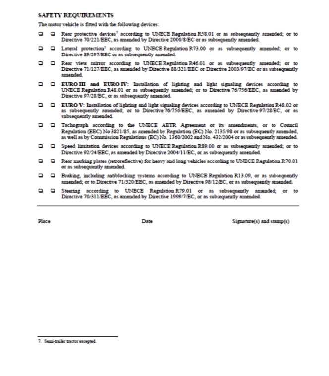 | □ □ Hátsó aláfutásgátló7 az ENSZ-EGB R58.01 sz. előírás, vagy annak későbbi módosításai, vagy a 2000/8/EK irányelvvel módosított, vagy a későbbiekben módosított 70/221/EGK irányelv szerint. |