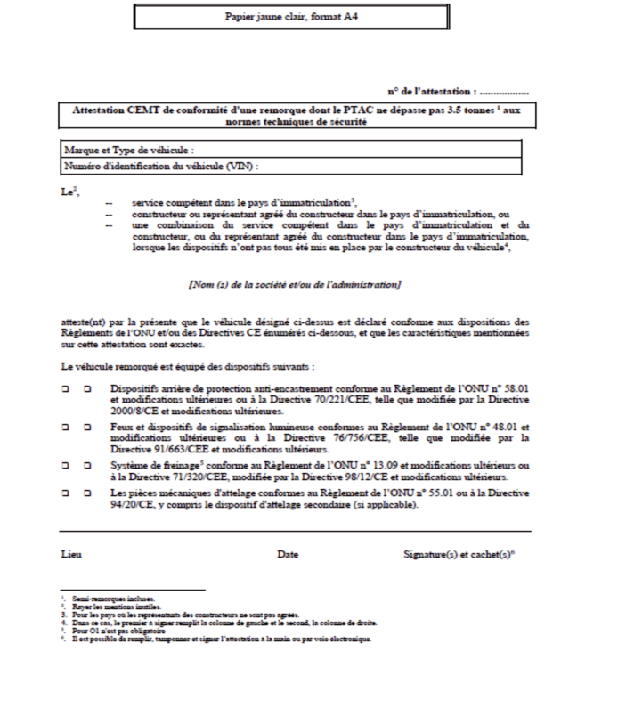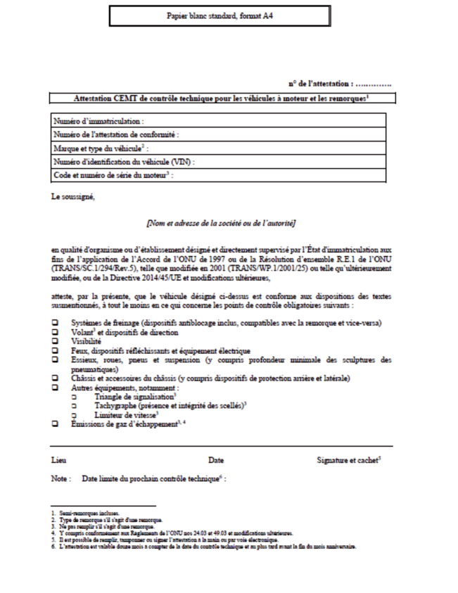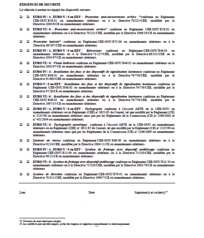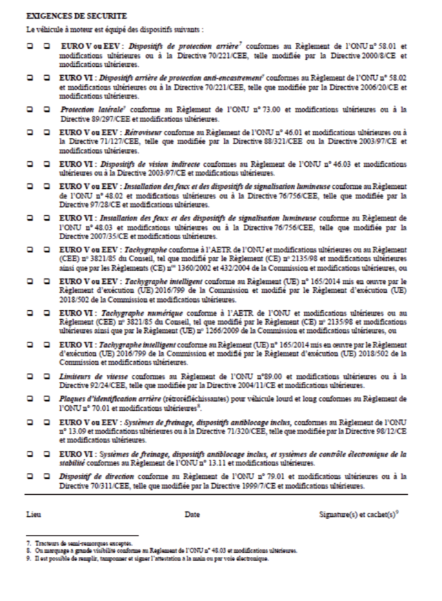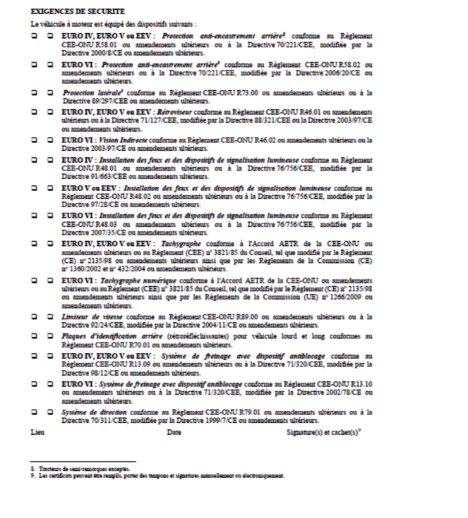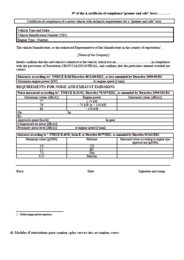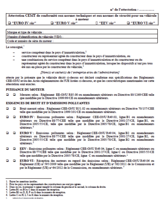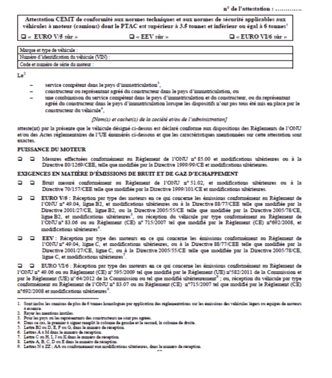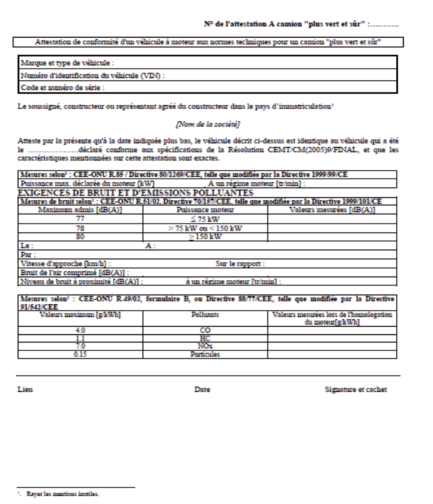 c) Modele d'attestation de conformite am normes techniques concernant les emissions sonores et polluantes et aus normes de securite pour an vehicule a moteur "EURO III súr", "EURO IV súr" ou "EURO V súr"