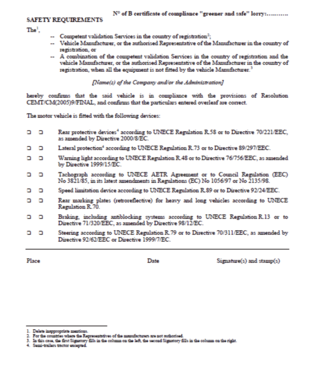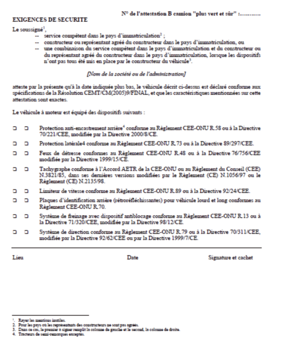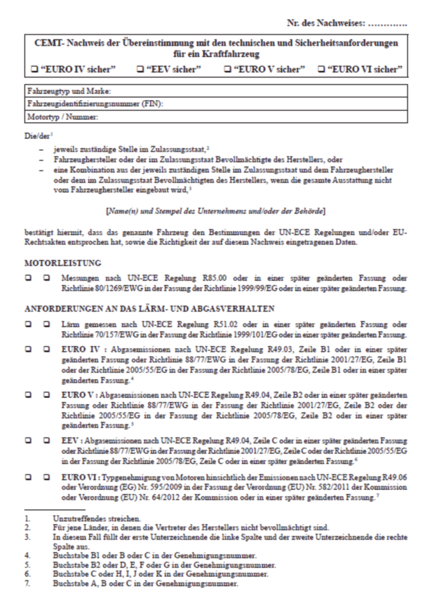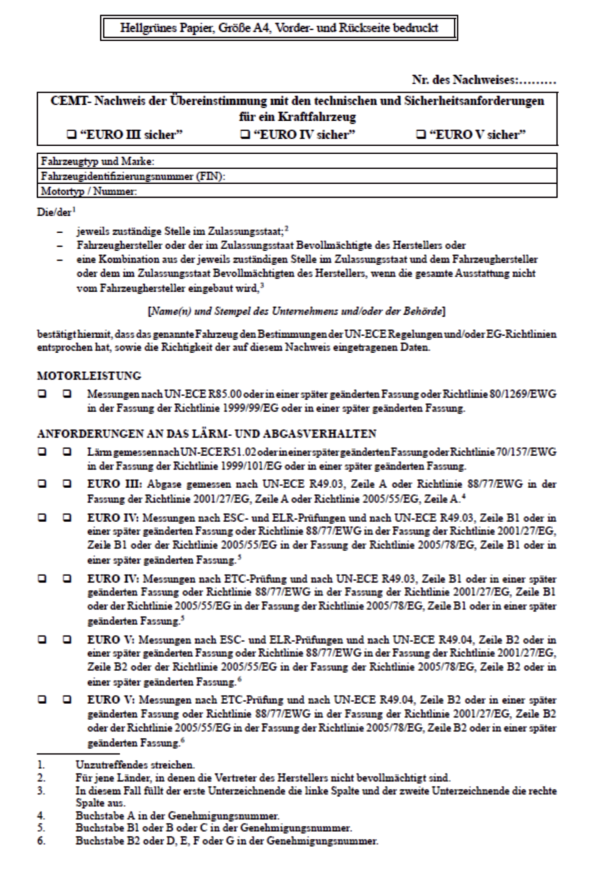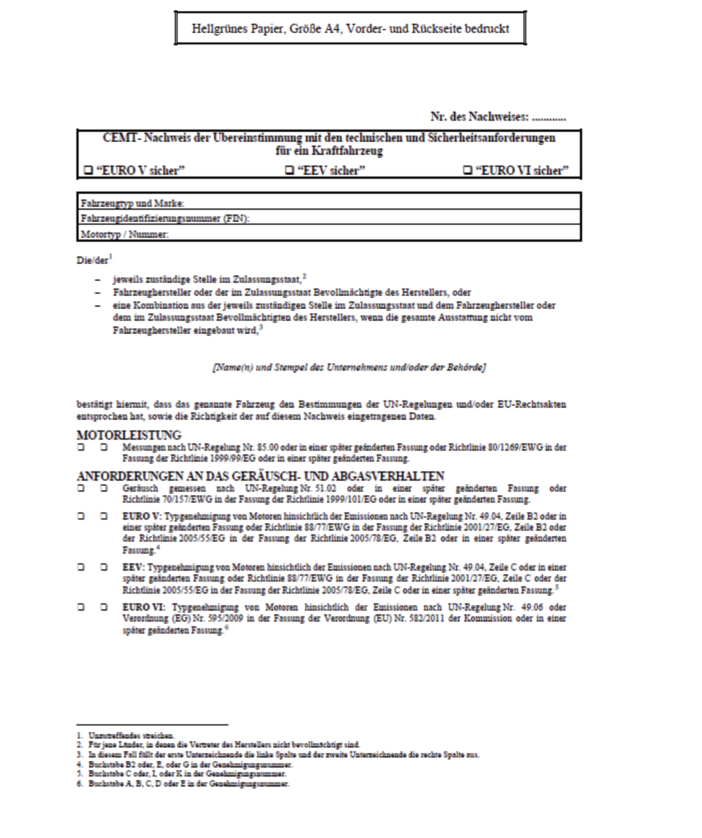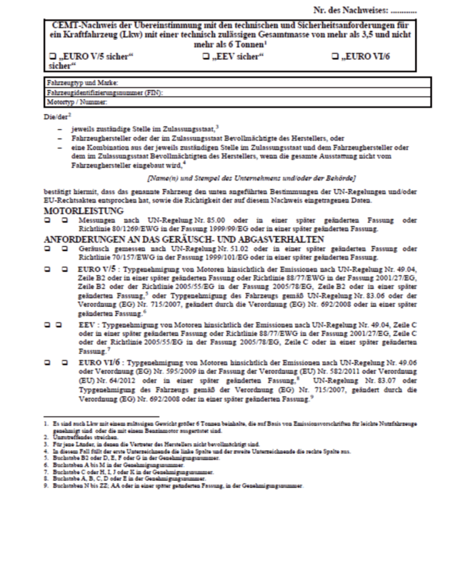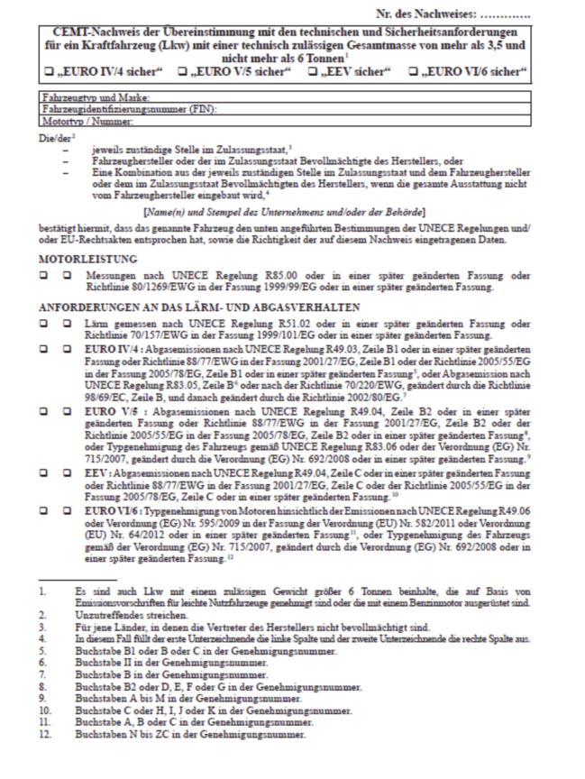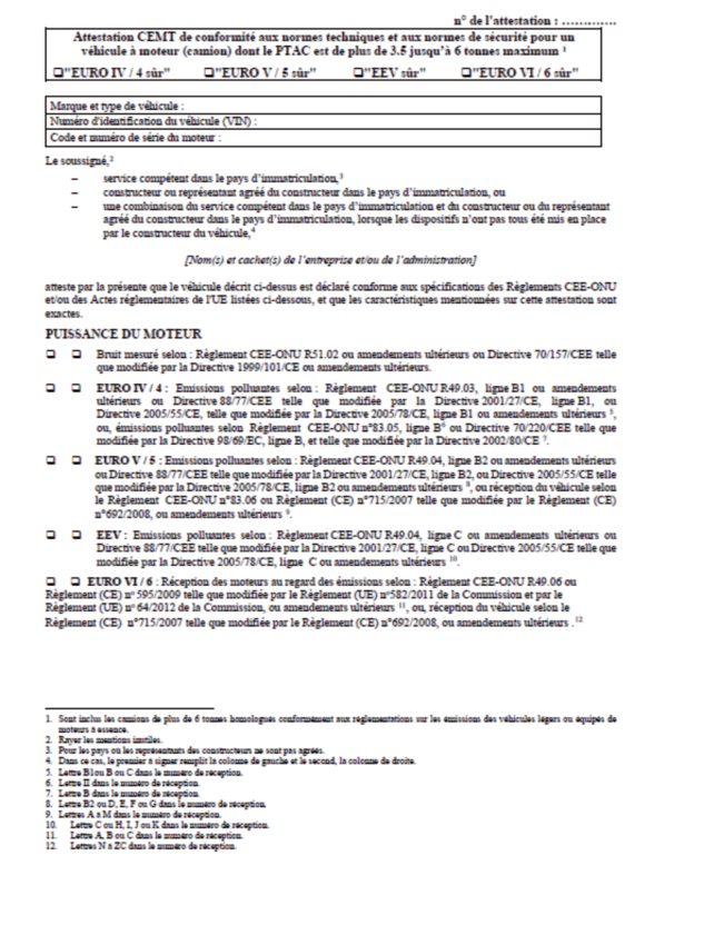 | CEMT igazolás tehergépkocsikhoz a jármű műszaki és biztonsági előírásoknak való megfelelőségéről □ "EURO III biztonságos" □ "EURO IV biztonságos" □ "EURO V biztonságos" | |||