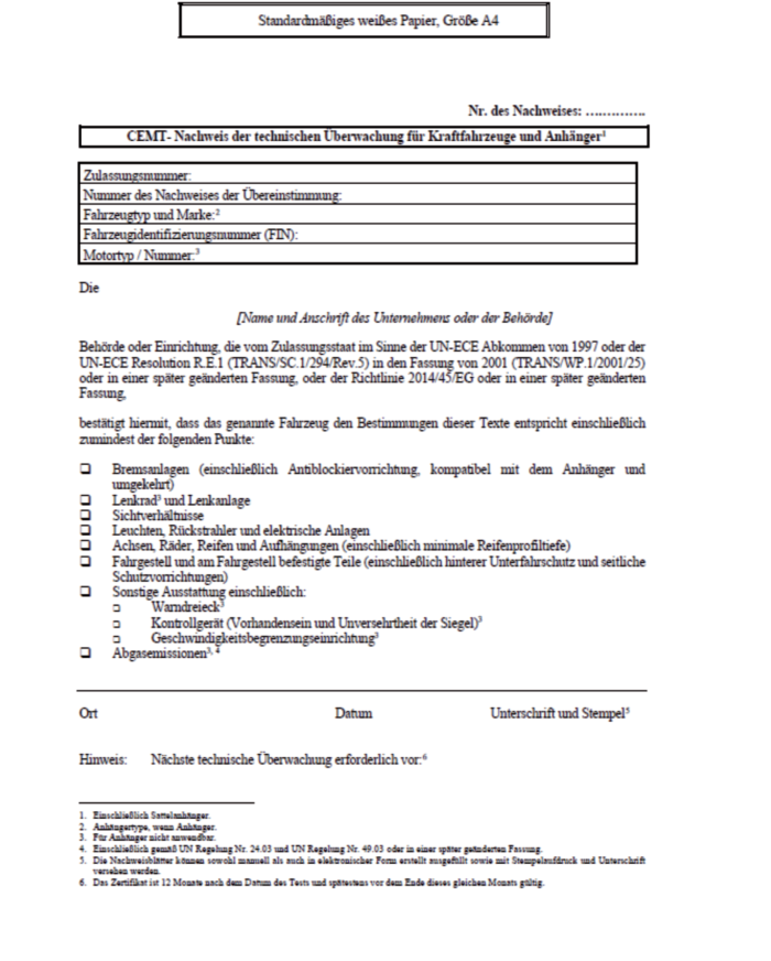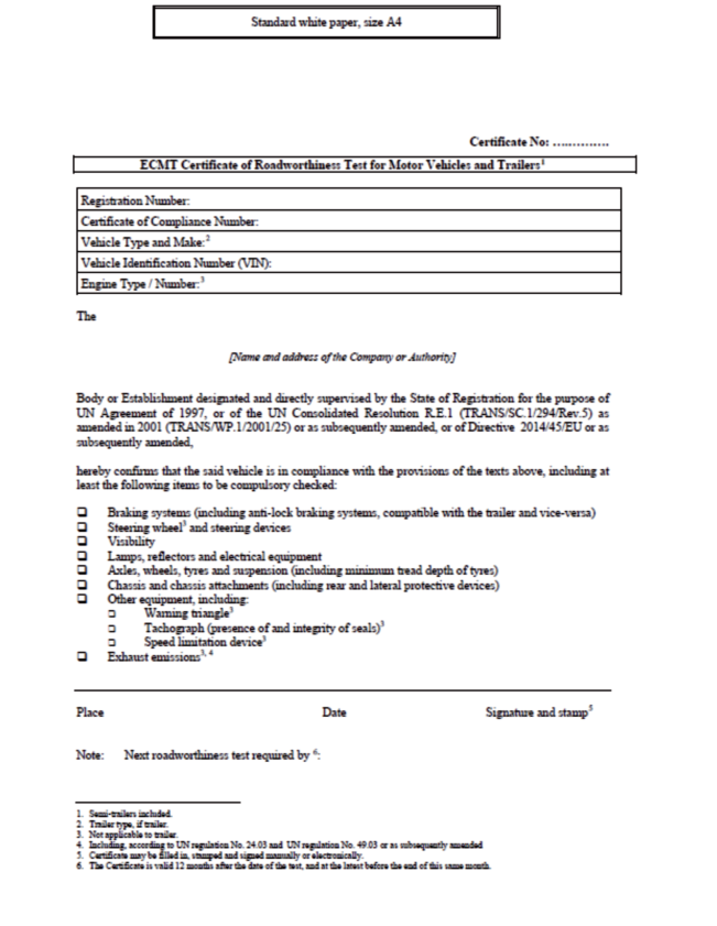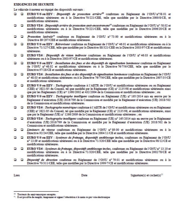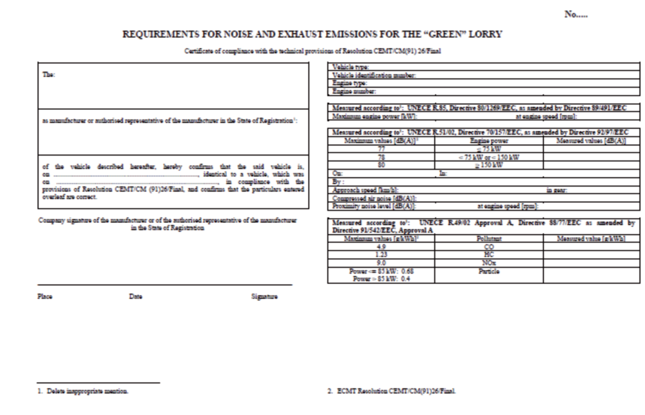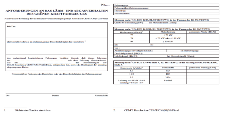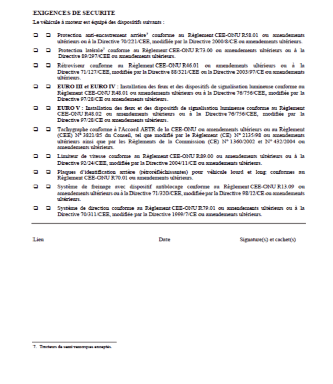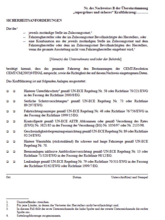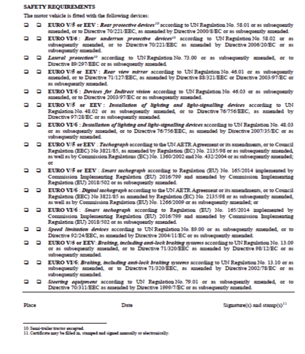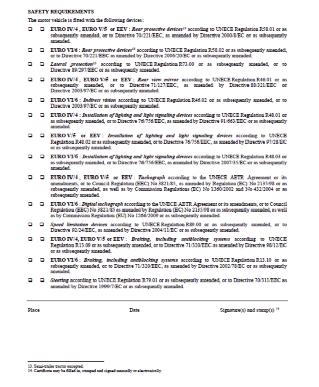 | CEMT igazolás tehergépkocsikhoz a jármű műszaki és biztonsági előírásoknak való megfelelőségéről □ "EURO III biztonságos" □ "EURO IV biztonságos" □ "EURO V biztonságos" | |||