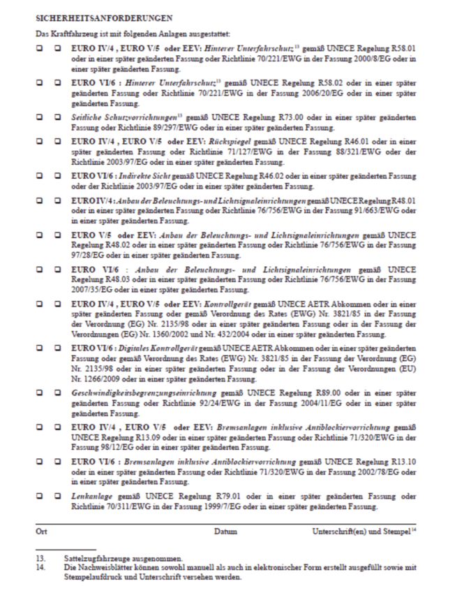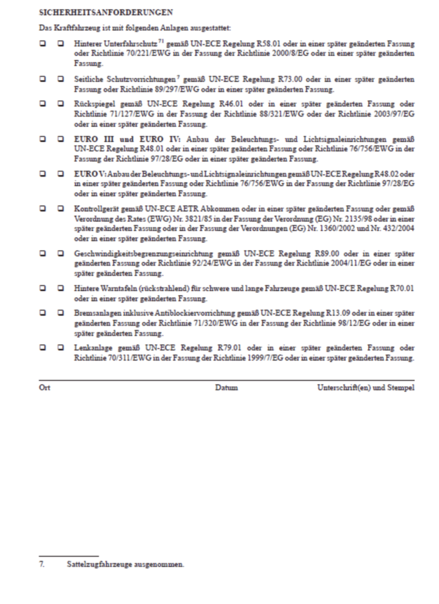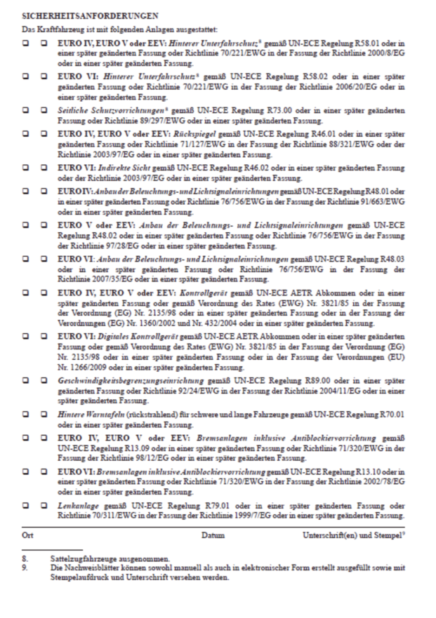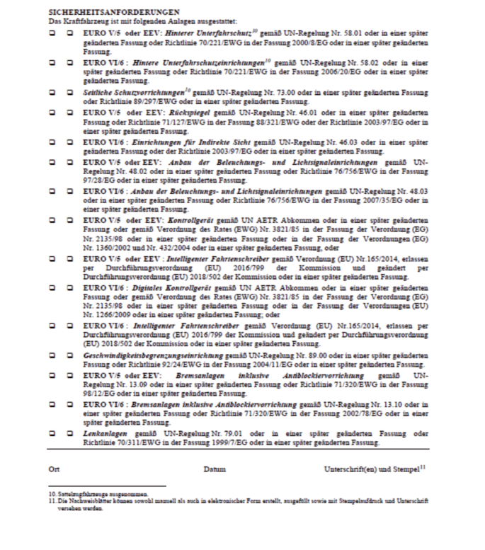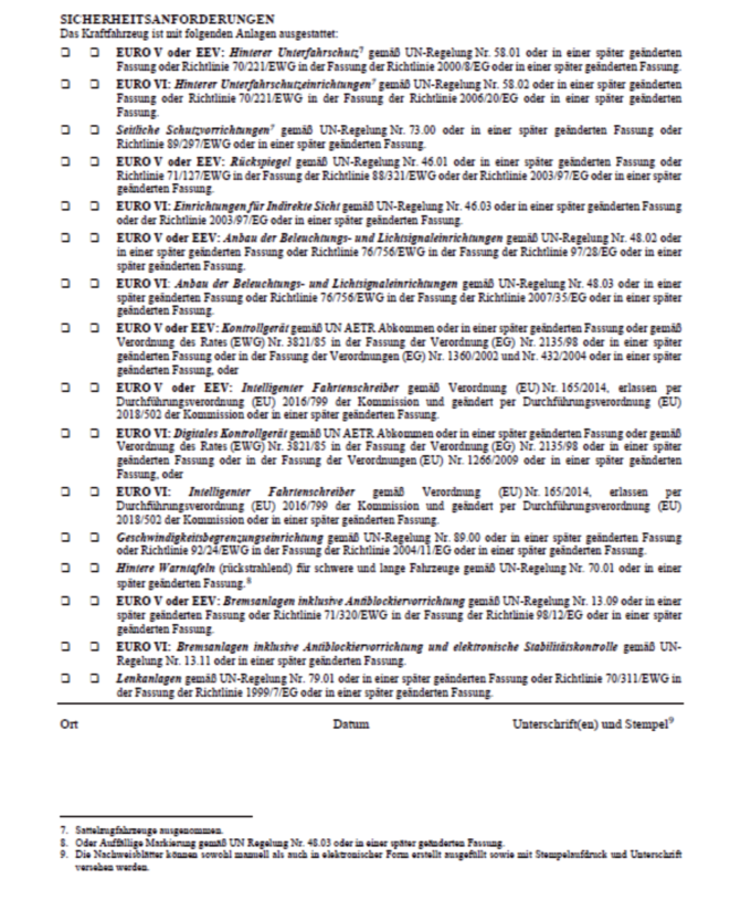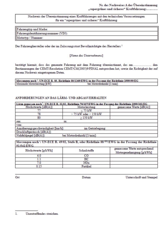c) Muster für den Nachweis der Übereinstimmung mit den technischen Voraussetzungen hinsichtlich des Abgas- und Lärmverhaltens und mit den Sicherheitsanforderungen für ein "EURO IIIsicheres", "EURO IV sicheres" oder "EURO V sicheres" Kraftfahrzeug