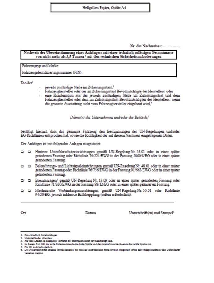 b) Muster für den Nachweis der Übereinsstimmung mit den technischen Voraussetzungen hinsichtlich des Abgas- und Lärmverhaltens und mit den Sicherheitsanforderungen für ein "EURO IV/4 sicheres", "EURO V/5 sicheres", "EEV sicheres" oder "EURO VI/6 sicheres" Kraftfahrzeug (Lkw) mit einer technisch zulässigen Gesamtmasse von mehr als 3,5 und nicht mehr als 6 Tonnen (einschließlich bestimmter Fälle bei Lkws über 6 Tonnen)