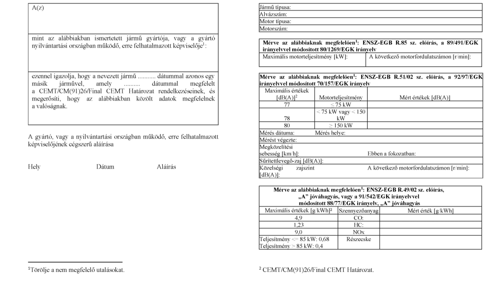 | □ □ EURO IV: Kipufogógáz-emissziók az ESC és ELR tesztciklusok alatt mérve: - az ENSZ-EGB R49.03 sz. előírás, B1-sor, vagy annak későbbi módosításai, vagy a 2001/27/EK irányelv B1-sorával módosított 88/77/EGK irányelv, vagy a 2005/78/EK irányelv B1-sorával módosított, vagy a későbbiekben módosított 2005/55/EK irányelv szerint)5. 1 Törölje a nem megfelelő utalásokat 2 Olyan országokban, ahol a gyártók képviselői nincsenek felhatalmazva. 3 Ebben az esetben az első Aláíró a bal oldalon tölti ki az oszlopot, a második Aláíró pedig a jobb oldalon. 4 A jóváhagyás számában az "A" karakter szerepel 5 A jóváhagyás számában a "B1", vagy "B" vagy "C" karakter szerepel | |||