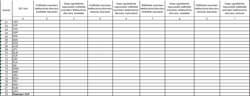 6.2. A táblában a határidős (forward, futures), opciós, egyszerű devizacsere (simple currency swap vagy Fx-swap), a nem amortizálódó, illetve az amortizálódó kamatozó devizacsere (CCIRS) ügyletekhez, a deviza kamatcsere ügyletekhez (only interest rate swap) és egyéb (pl. határidős értékpapír) ügyletekhez kapcsolódó letéti (margin) számlák állományából származó követeléseket és tartozásokat ügyletenként kell meghatározni és besorolni, amelyet devizanemenként, valamint belföld és külföld bontásban kell megadni a megfelelő - b), d), f), illetve h) - oszlopban. A c), e), g) és i) oszlopban ki kell emelni, hogy a b), d), f) és h) oszlopban jelzett állományokból mennyi a swap ügyletekhez kapcsolódó belföldi és külföldi letétiszámla-állományra vonatkozó követelés, valamint tartozás. A táblában minden ügylethez kapcsolódó letétiszámla- követelményre vonatkozó állományt jelenteni kell attól függetlenül, hogy bizonyos devizaárfolyam kockázatot hordozó ügyletek [pl. deviza kamatcsere ügyletek (only interest rate swap)] nem jelentendők csak a K14 MNB azonosító kódú adatszolgáltatásban, vagy nem deviza származékos ügyletek [pl. kamatswap ügyletek (interest rate swap)].