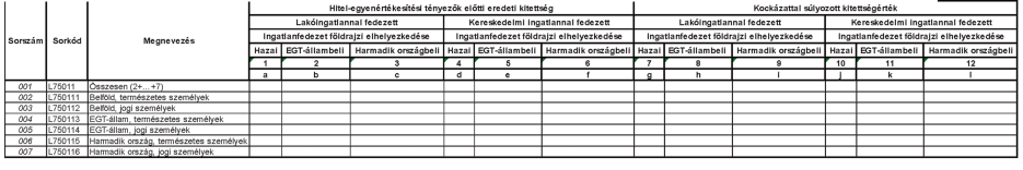 | 68a | L75 | Negyedéves jelentés a lakó- és kereskedelmi ingatlannal fedezett hitelkockázati kitettségekről | összevont alapú felügyelet alá tartozó, hitelintézeti csoportot vezető hitelintézet, valamint - a harmadik országbeli hitelintézet fióktelepe, az Eximbank Zrt., a KELER Zrt. és az MFB Zrt. kivételével - az összevont alapú felügyelet alá nem tartozó hitelintézet | negyedéves | elektronikus úton (ERA rendszer), fokozott biztonságú vagy minősített elektronikus aláírással ellátva | első negyedév tekintetében: a tárgyidőszakot követő második hónap 12. nap; második - negyedik negyedév tekintetében: a tárgyidőszakot követő második hónap 11. nap; |